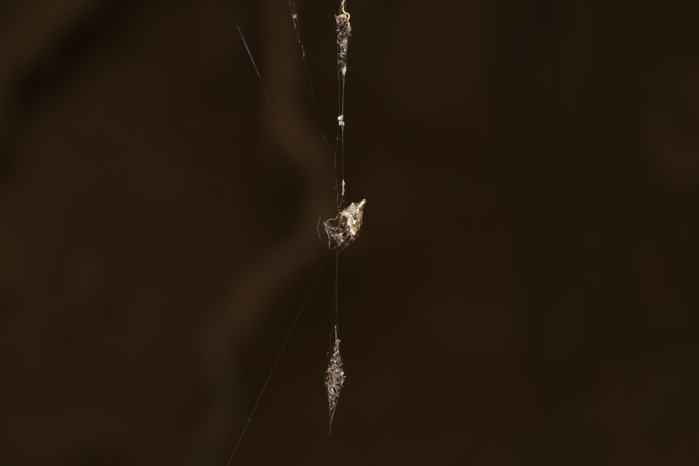 In addition, Uloborus ferokus spiders are commensal with these nests, presumably without too much predation. They build their own orb webs anchored on S. sarasinorum nests, help themselves to some extra food that gets caught (a little kleptoparasitism never did anyone any harm), and also apparently have extra protection from the Idris wasp (Scelionidae) which is an egg parasite of U. ferokus.