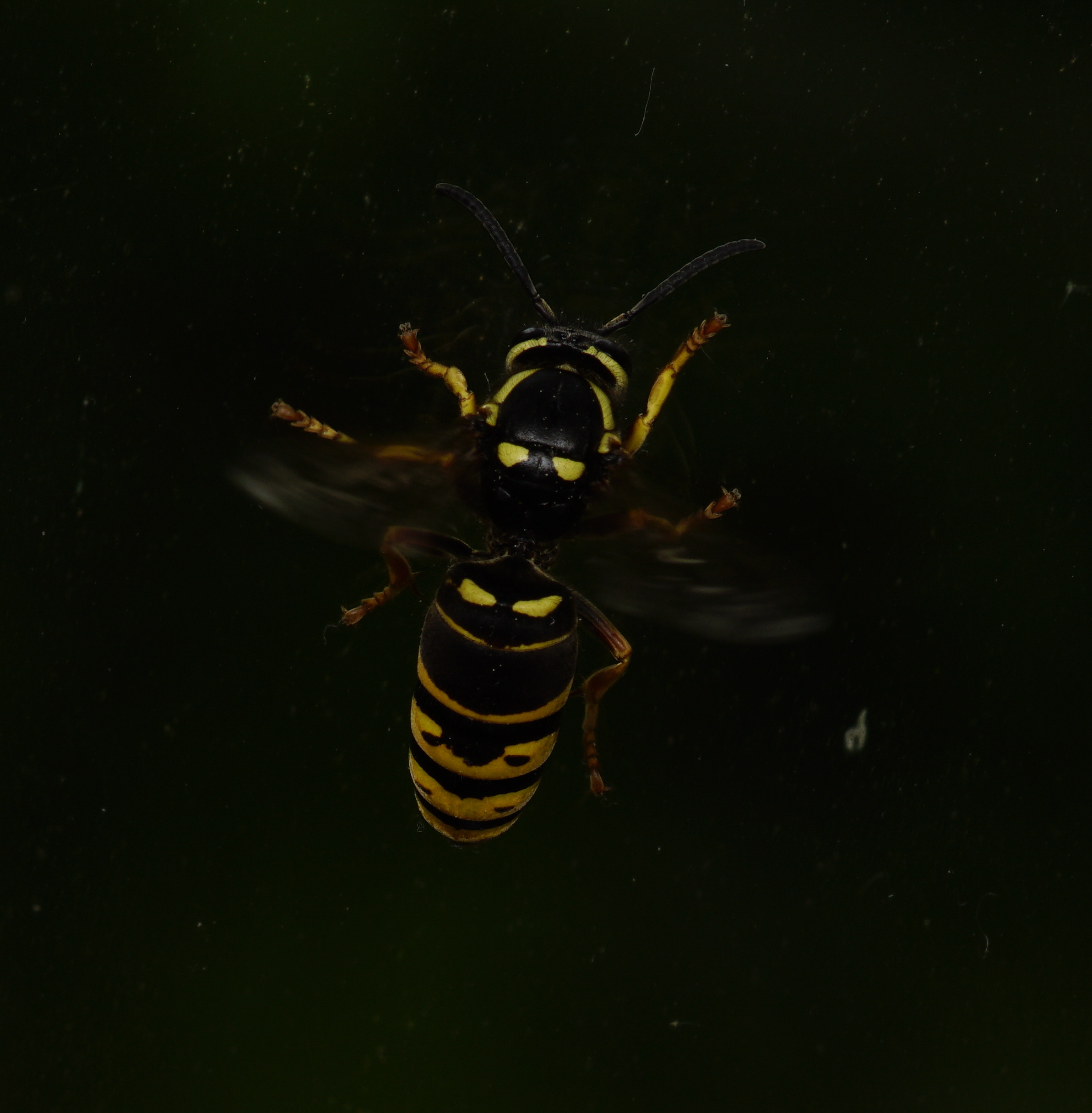 This wasp, I think, is Vespula vidua (the widow yellowjacket). That means there’s a yellowjacket nest near by. I’m fine with that — they are genuinely fascinating.