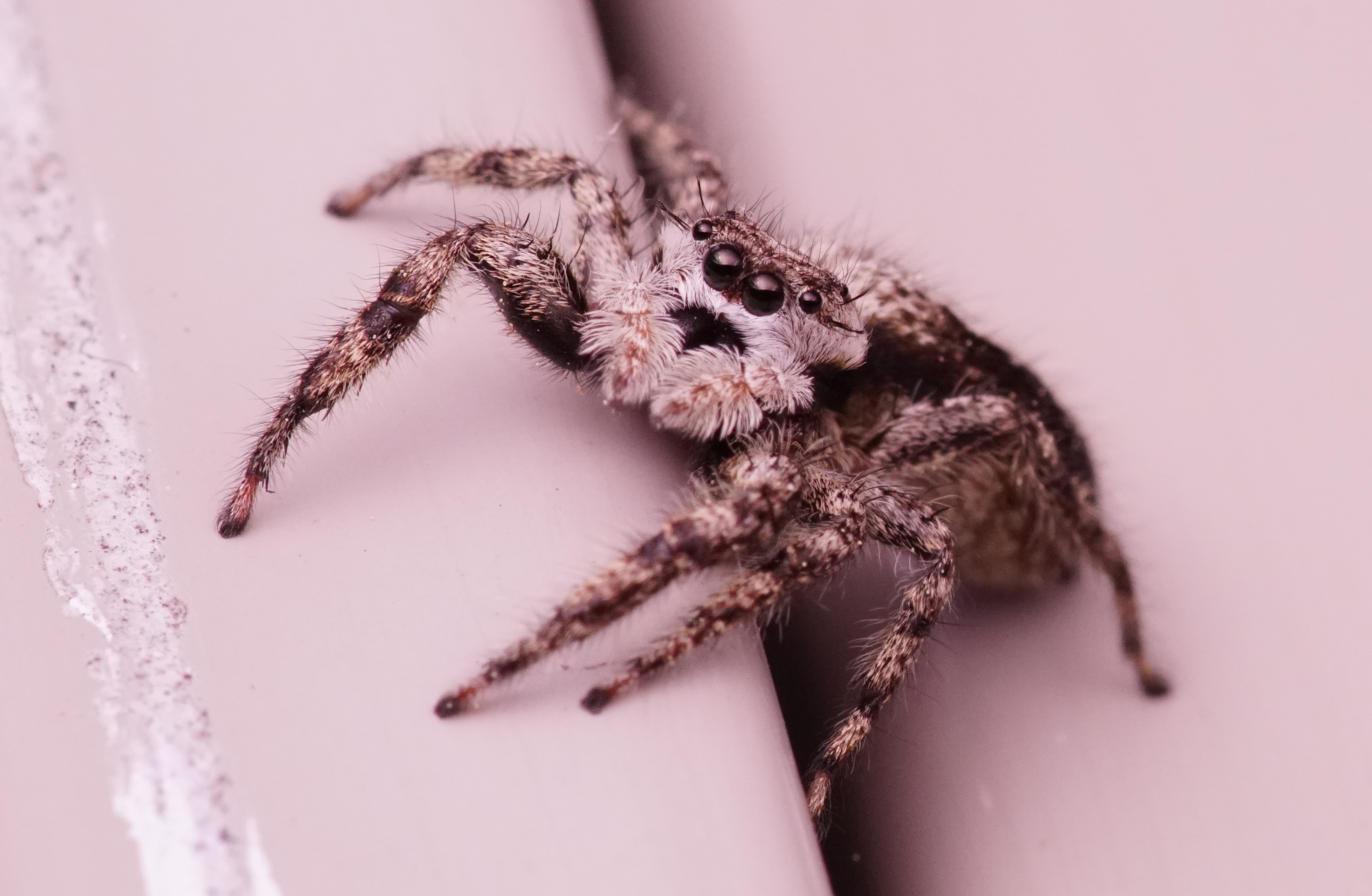 Then there’s this girl. I’ve seen her regularly when I step out onto the porch. She’s a Platycryptus undatus and I’ve named her Grizzlee. Not sure why the white balance got so red, by the way.