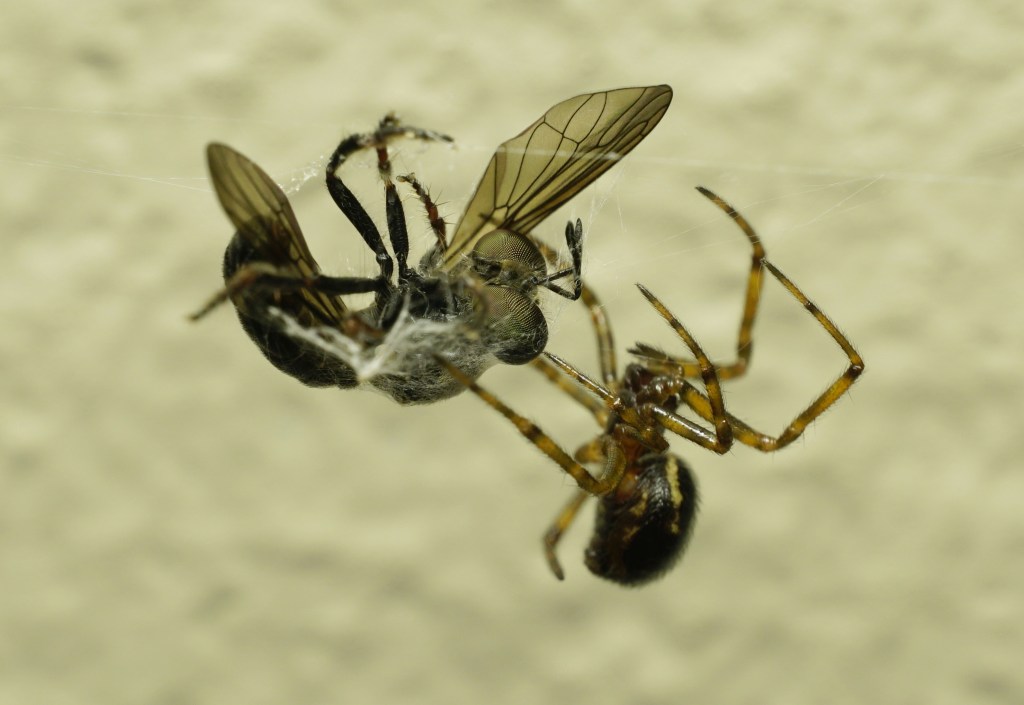 Theridiidae spider, what’s the prey? A robber fly, I believe.