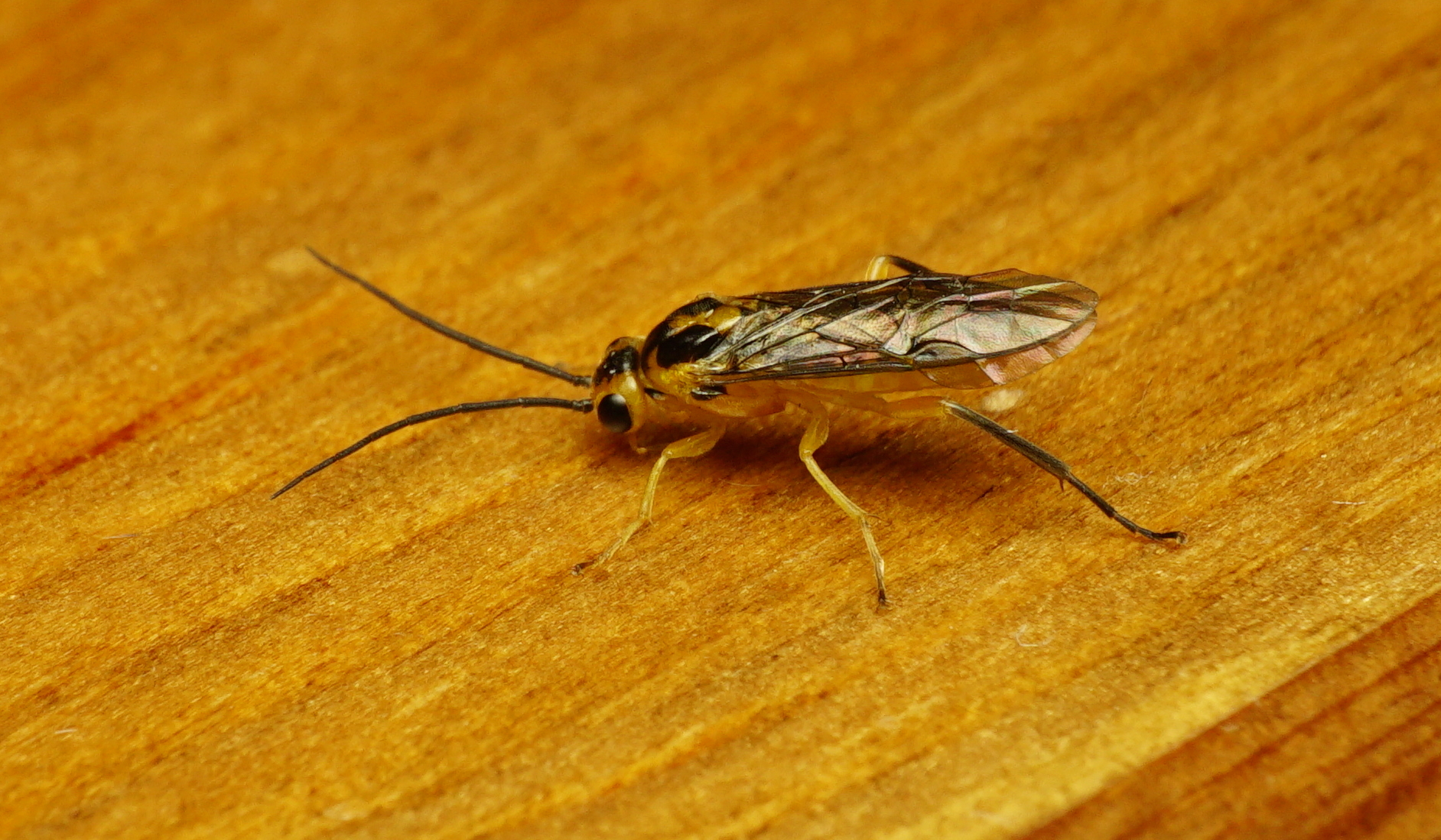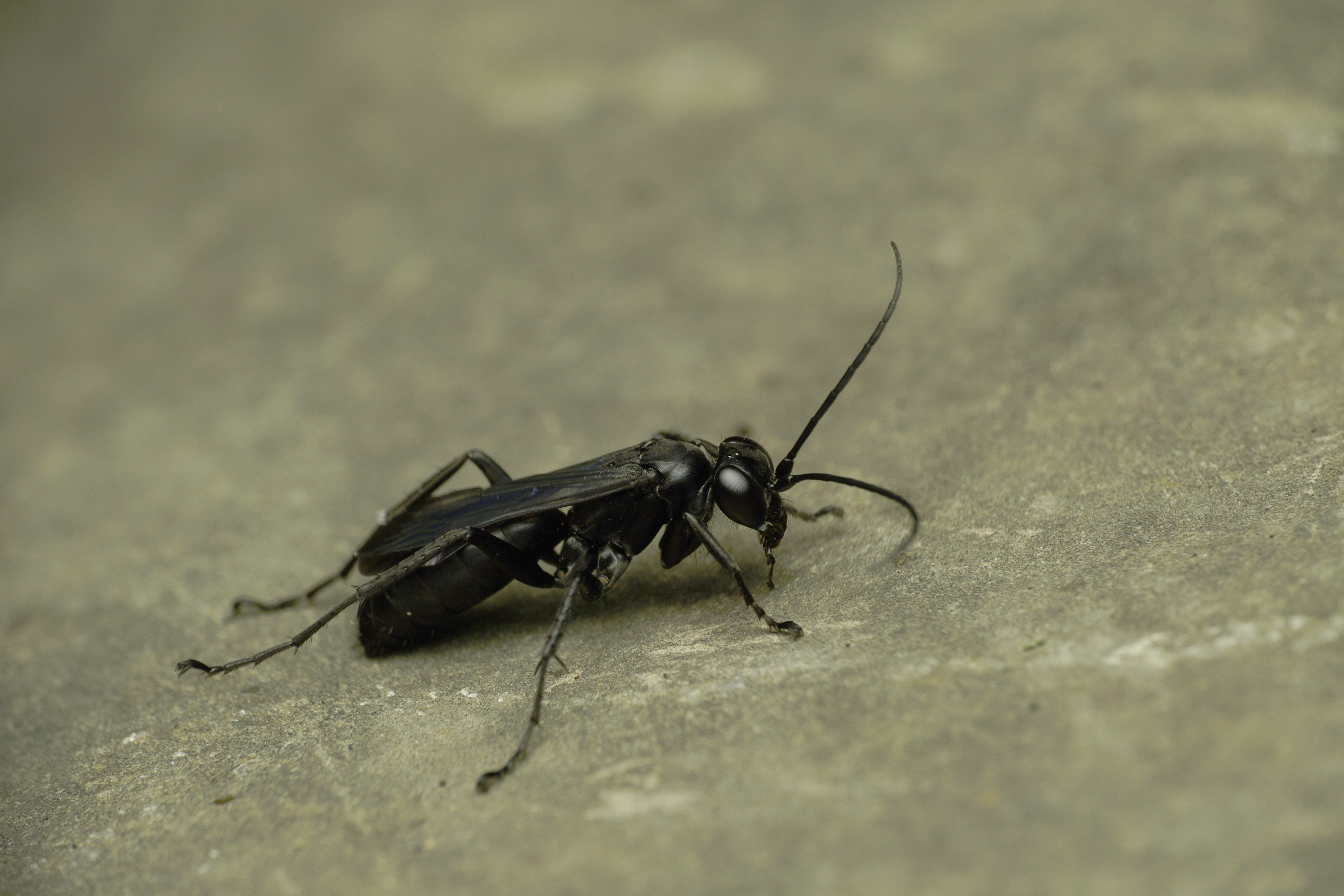 Trypoxylon. Distinguished from Pemphredoninae by the little notch protruding into the eye at the middle level.