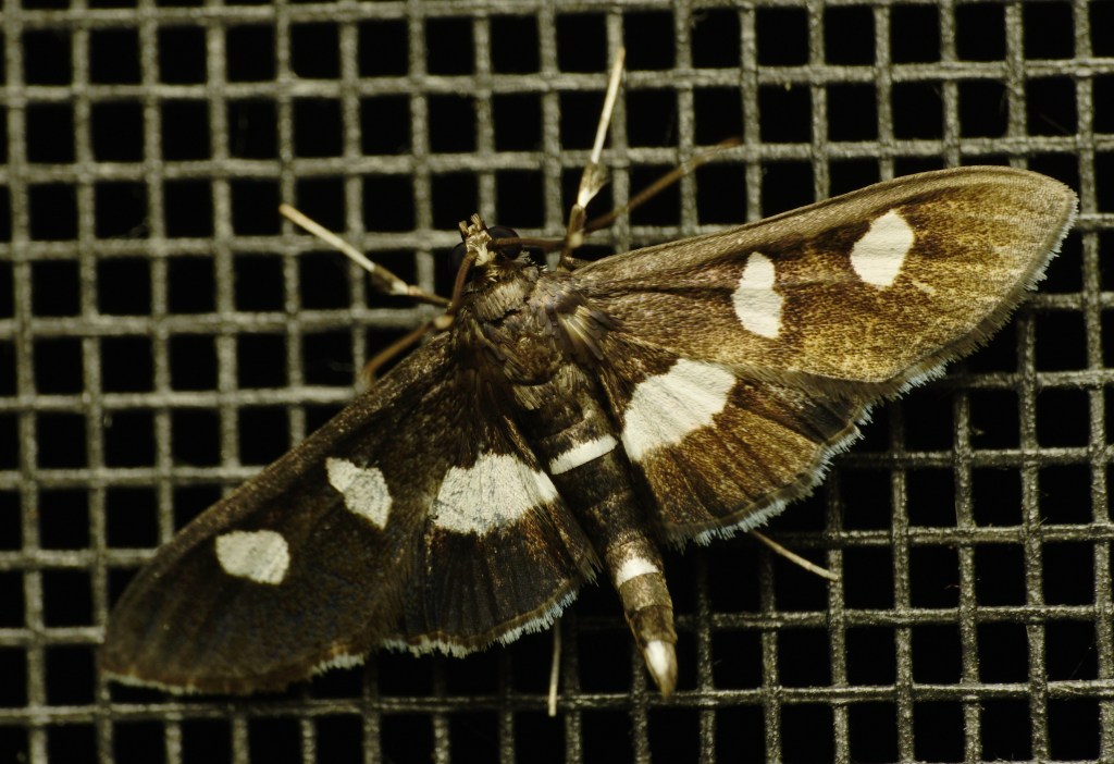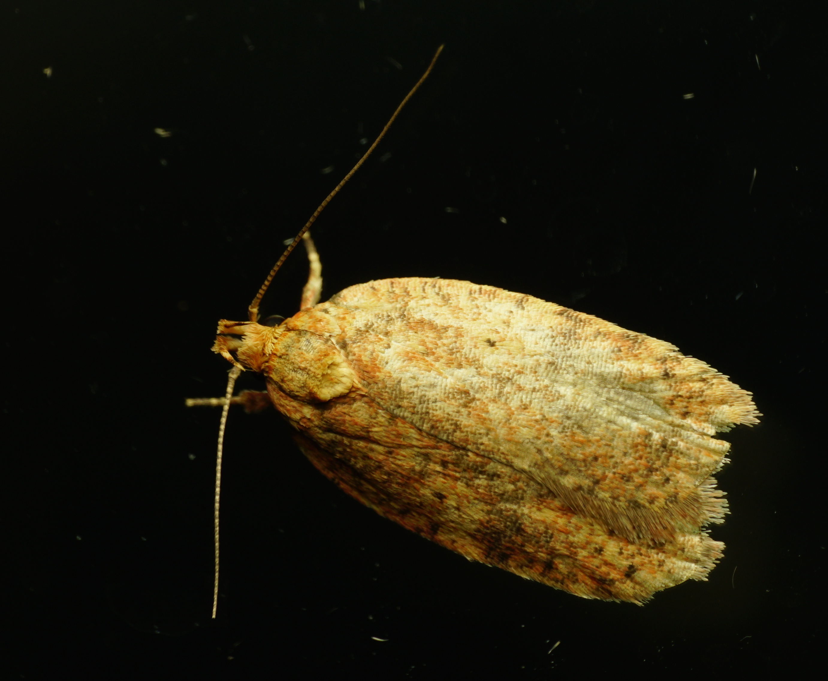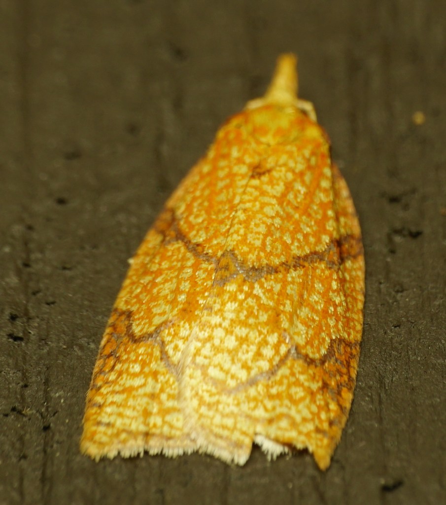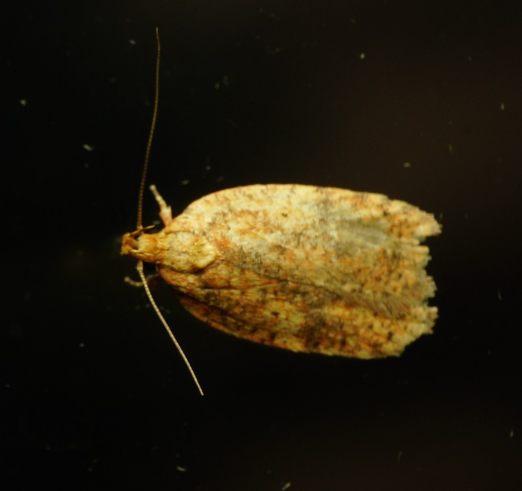 Looks similar, but not identical, to Agonopterix robiniella, Four-Dotted Agonopterix (a grass miner moth). Less similar to Acleris forskaleana, Hairnet Acleris.