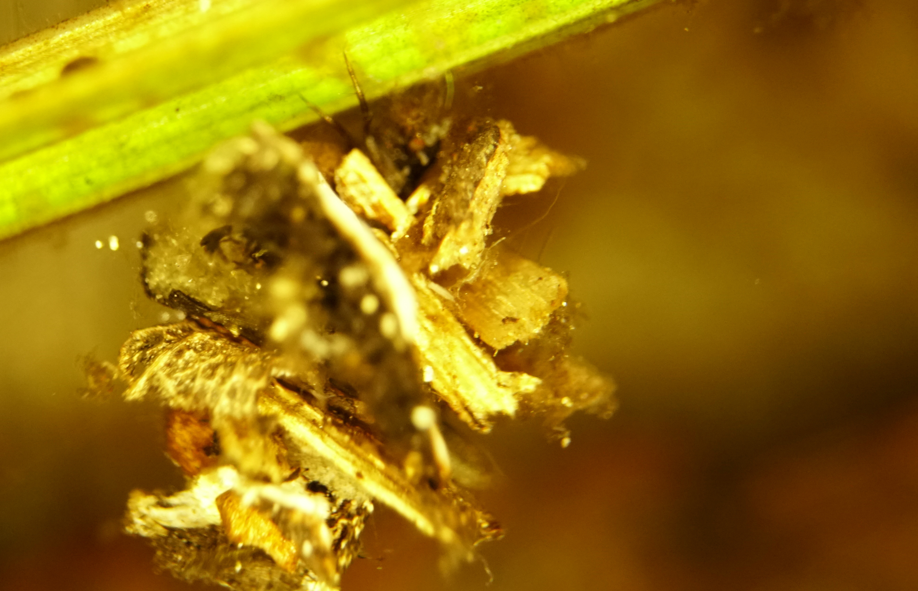 A caddisfly larvae in its casing. You can see the legs, but the main body is out of focus: