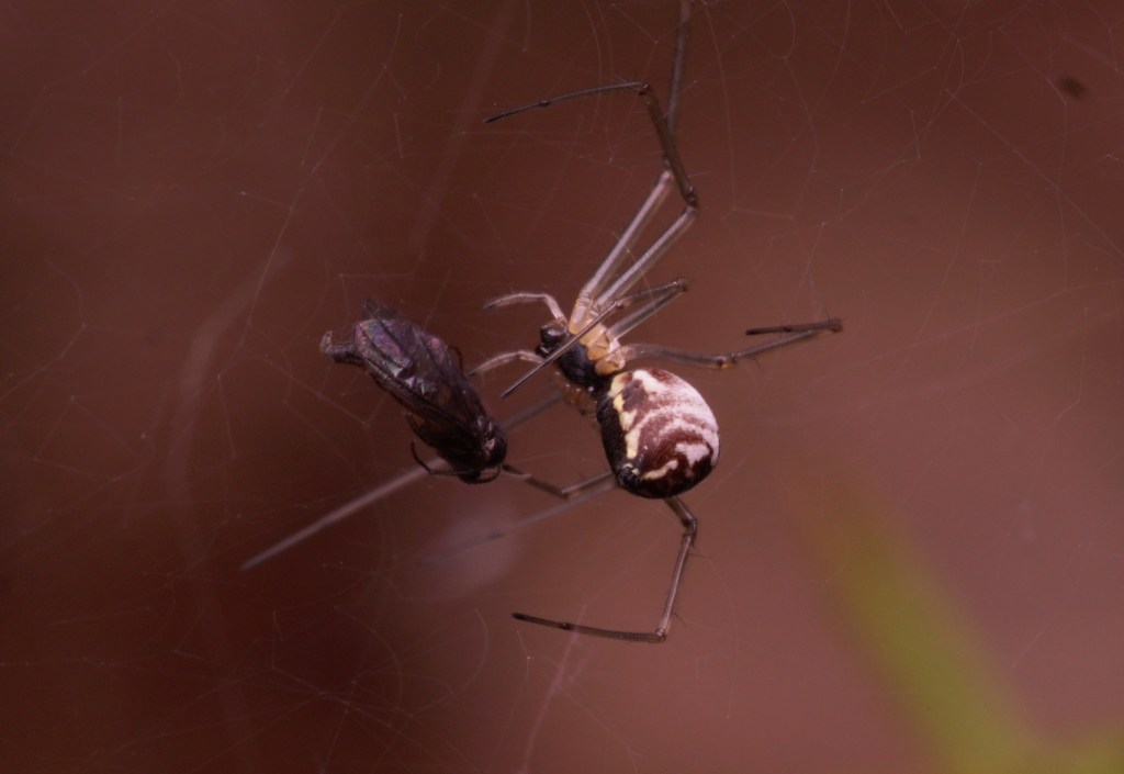 Dolomedes tenebrosus, in Pisauridae. A male. Note that the W pattern on the abdomen isn’t all white.