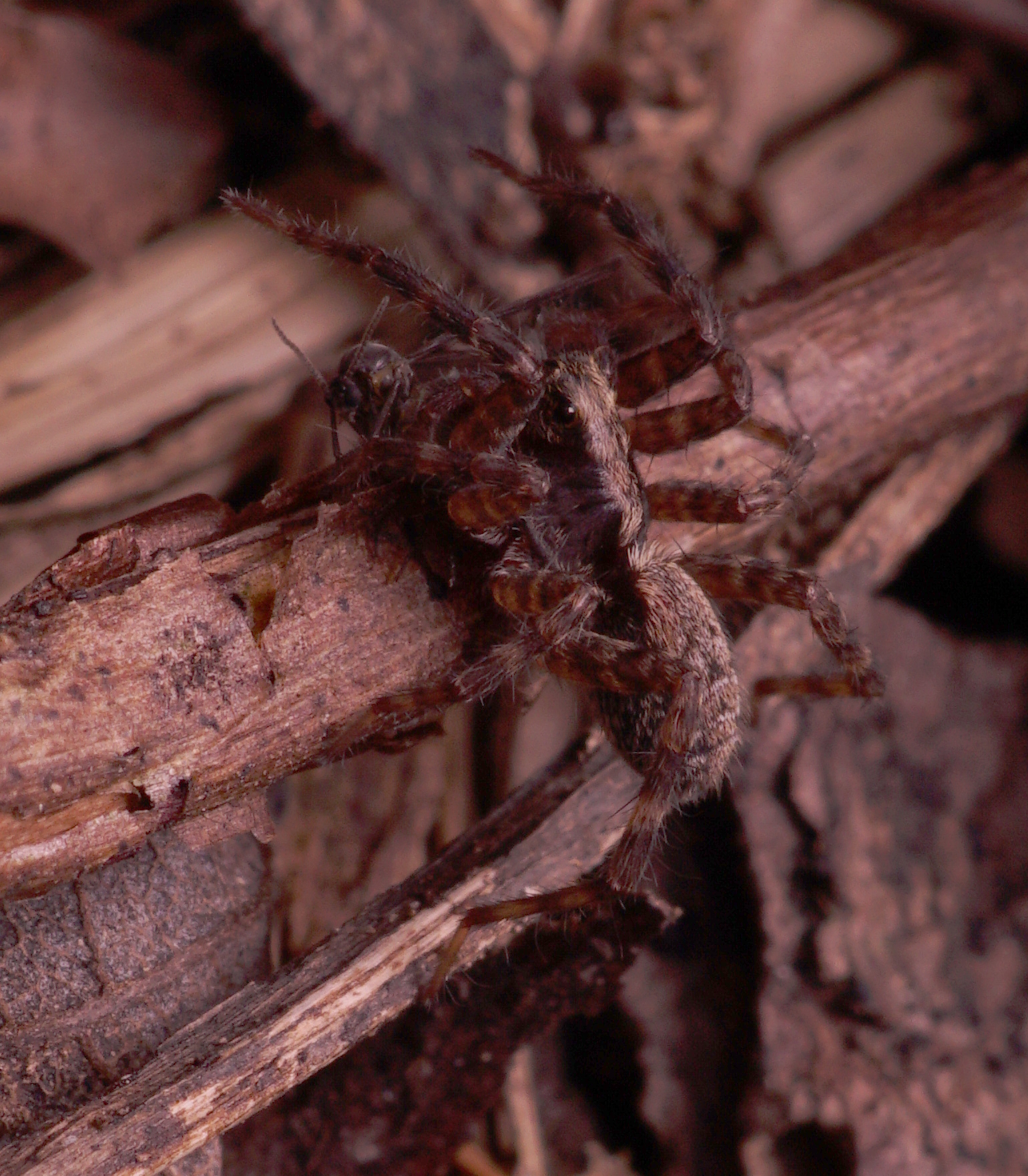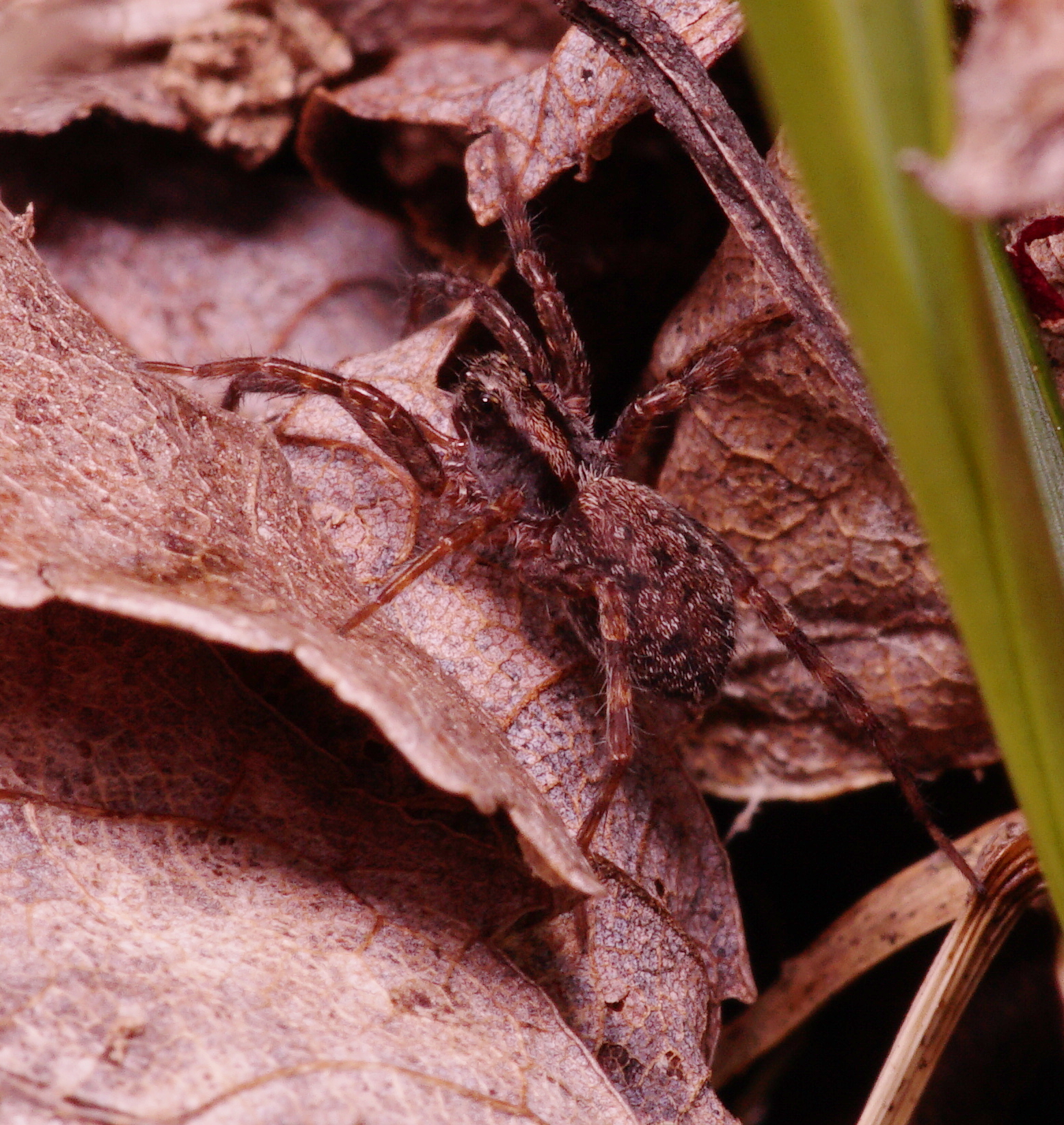 Dolomedes tenebrosus, in Pisauridae. A male. Note that the W pattern on the abdomen isn’t all white.
