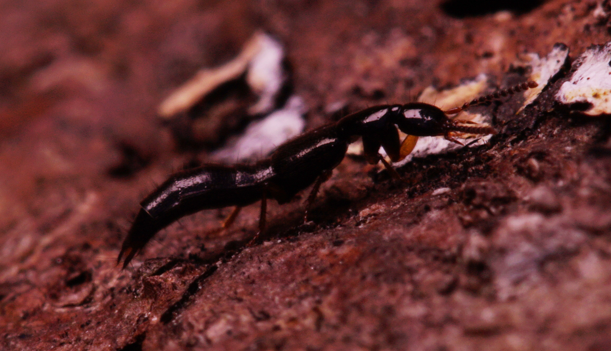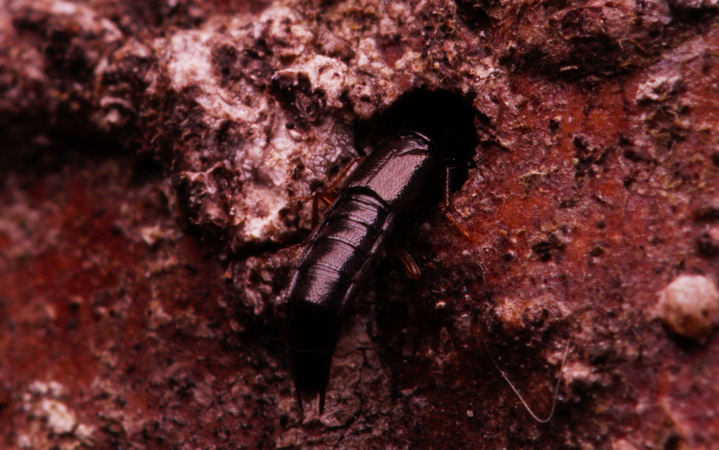 Staphylinidae, aka Rove beetles. For some reason, I think this one was especially interested in the holes in the dead wood that beetle grubs had tunneled out of. Not sure why, what in them was so interesting.