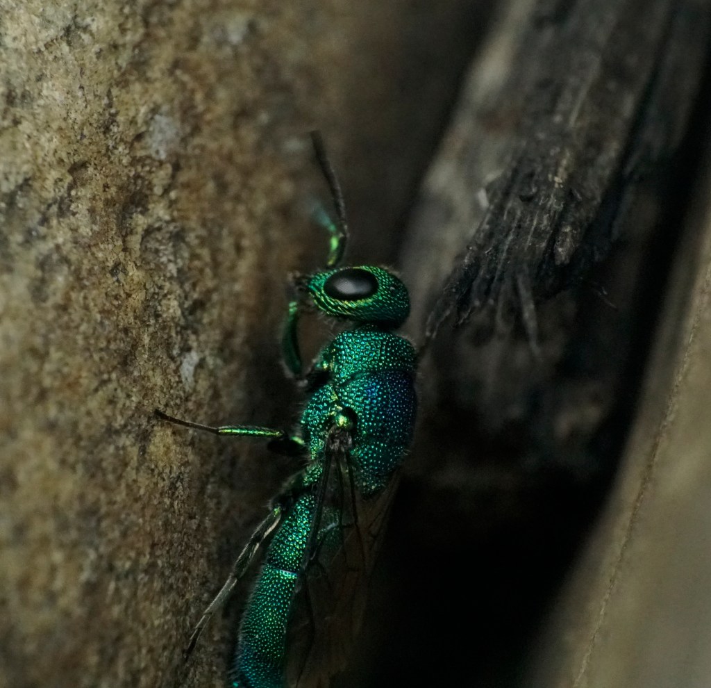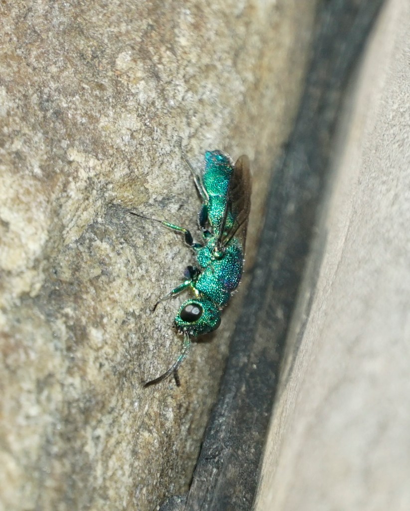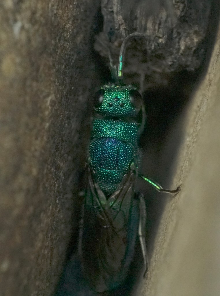 One of the stars of the show: a cuckoo wasp, Chrysididae. This particular one is in genus Chrysis. I’ve gotten photos of them before, but they were the type you wouldn’t show anyone else, because they would silently pity you.