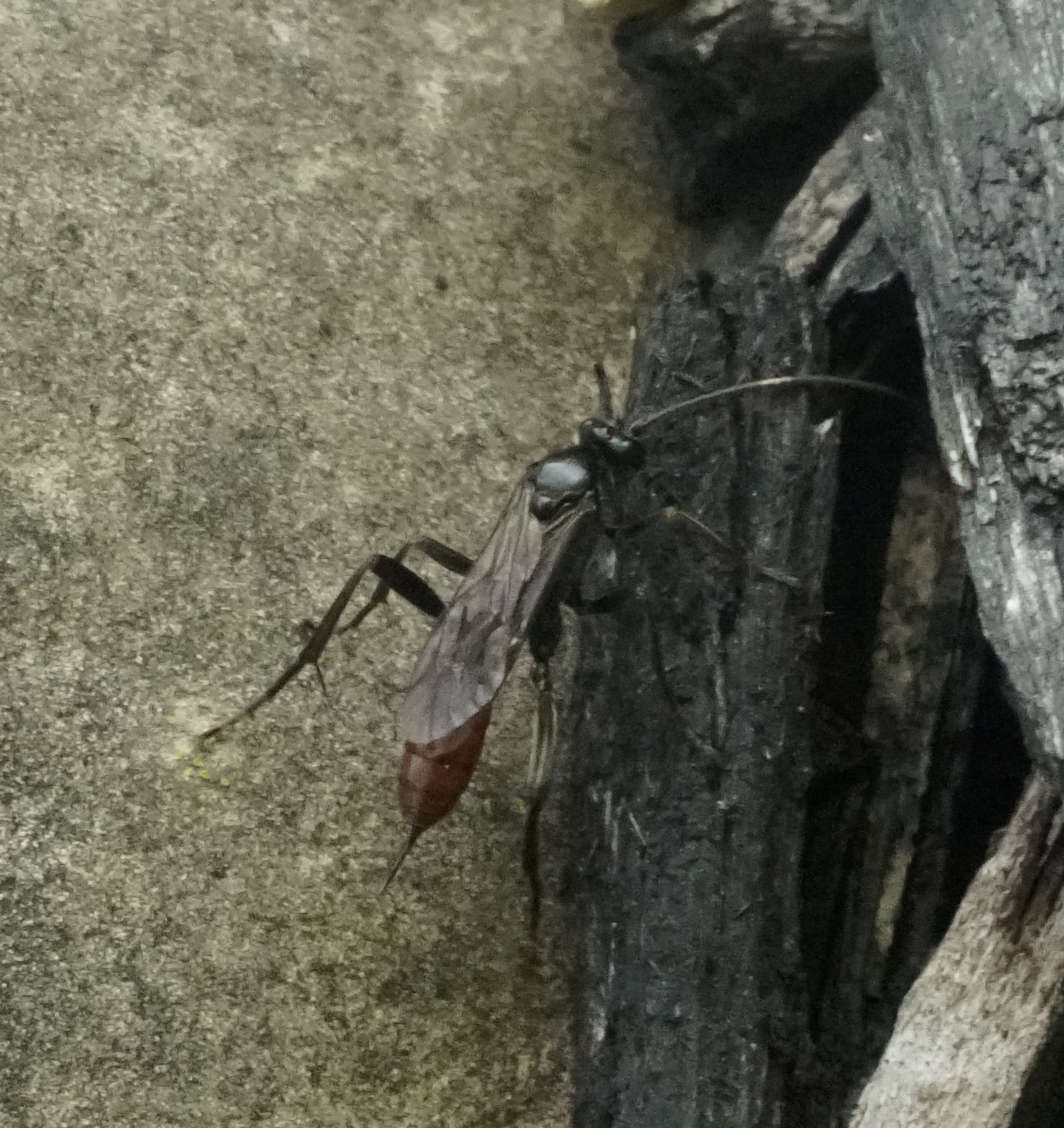 The reason I was able to get some decent photos this time (ahem, besides my outstanding skill and perseverance) was that it seemed to have found an area to investigate and stayed there for a while. I can only presume that that area was a nest for some other wasp, but it didn’t seem to be so to my own eyes.