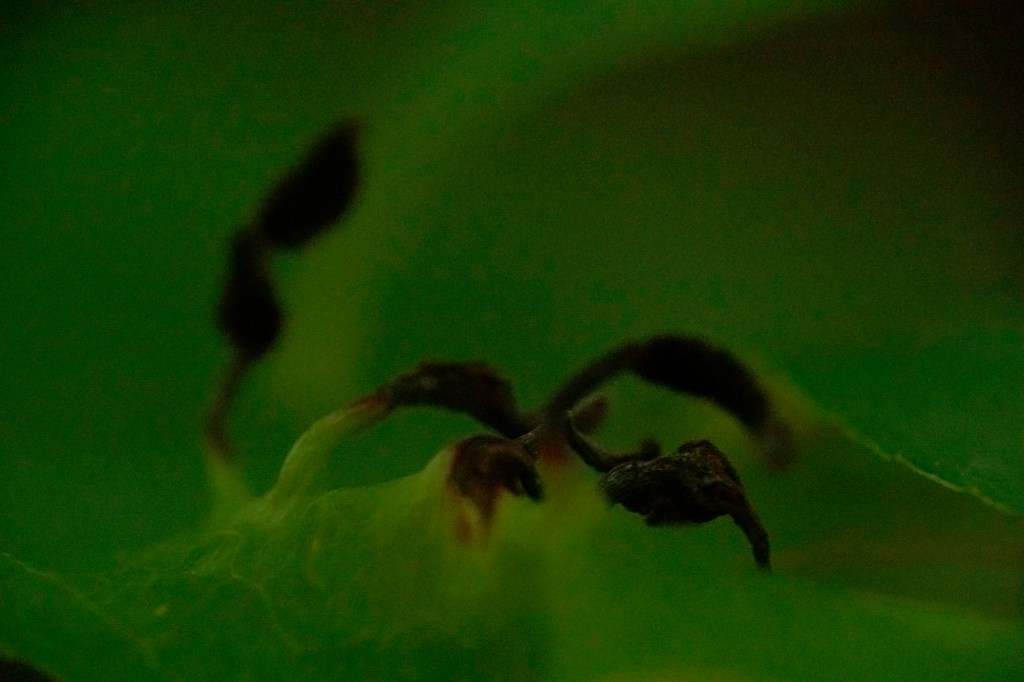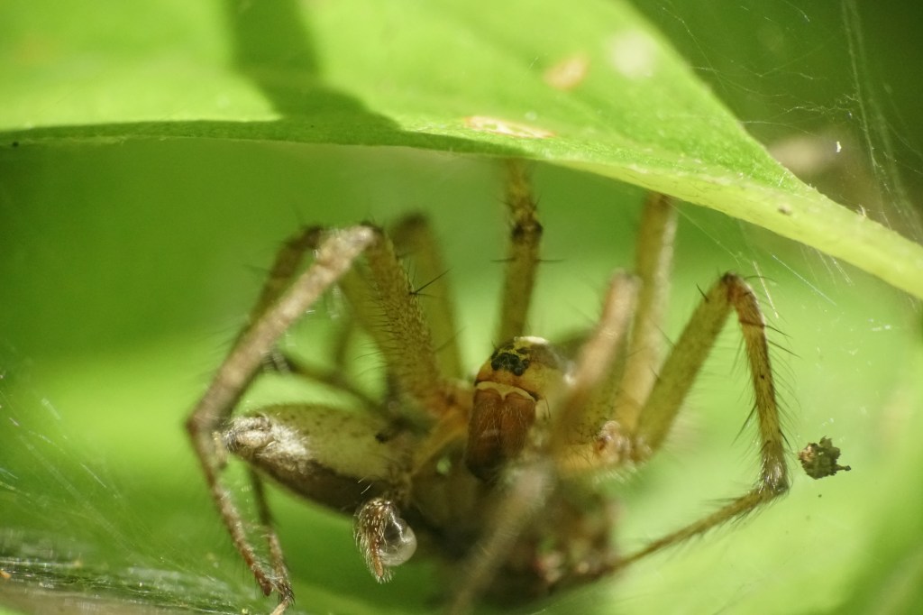 Agelenopsis. Note the distended palps. That’s a male mating with the female.