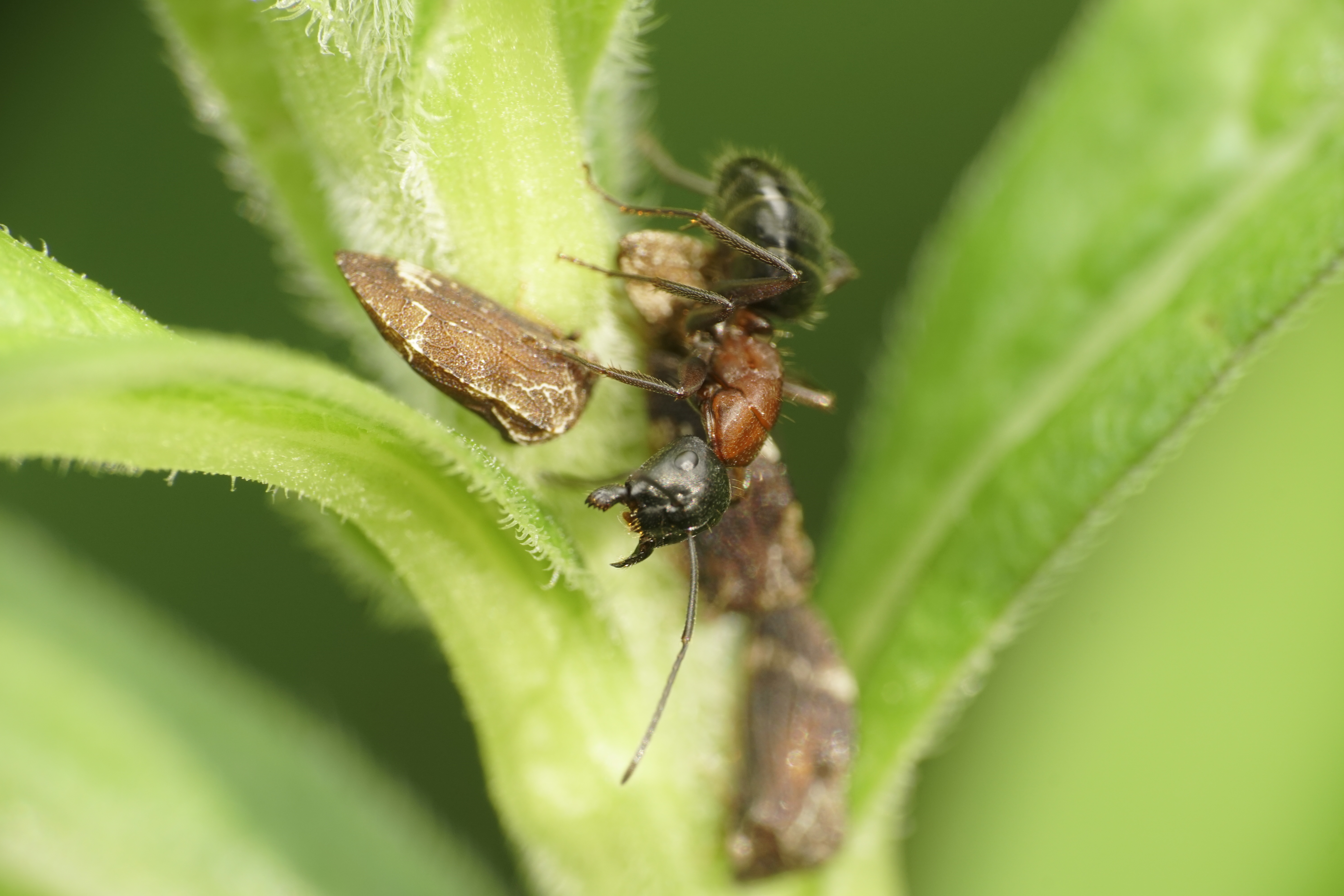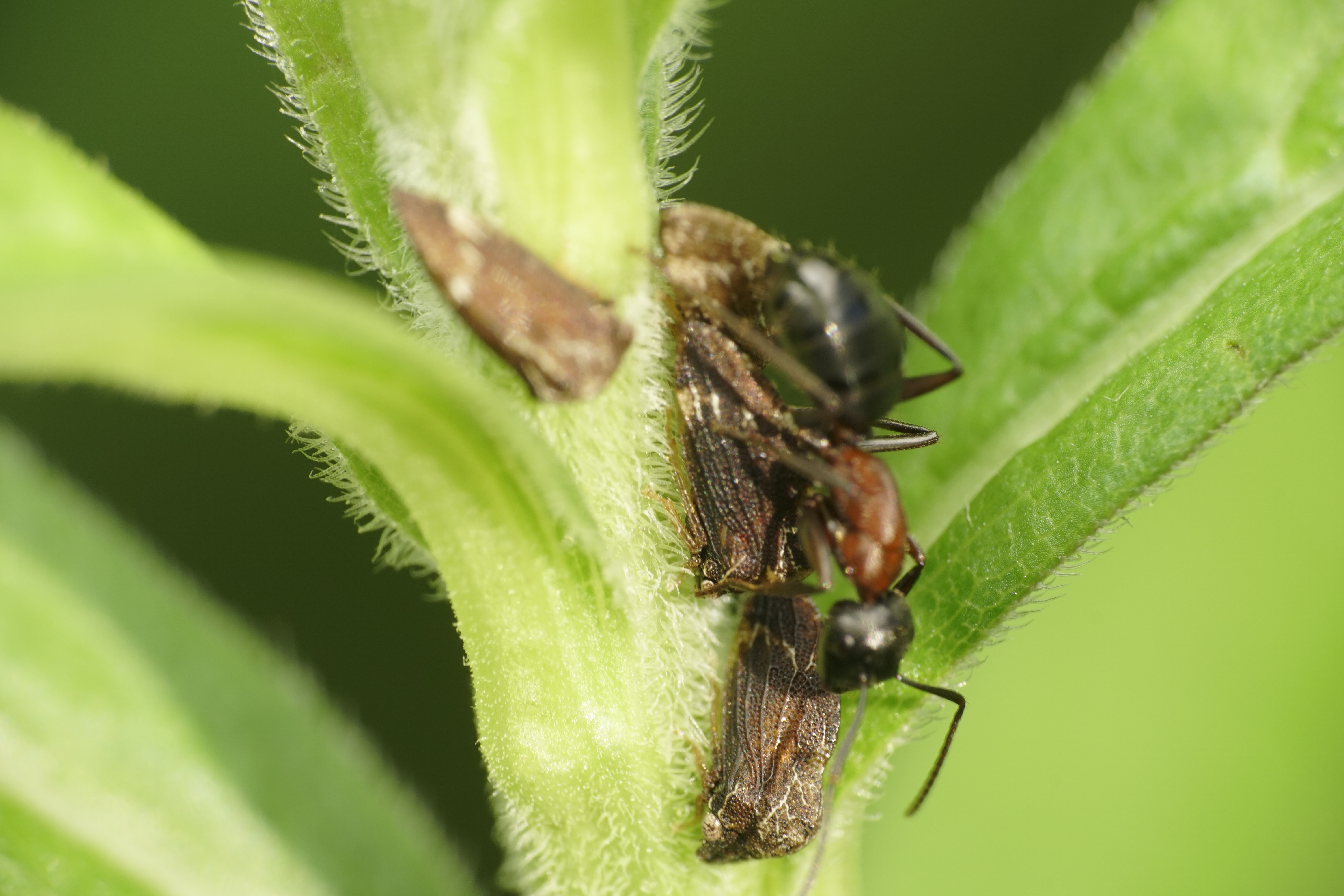 Fun symbiosis! Ants protect treehoppers from predators, treehoppers give ants honeydew from their anuses. Yum.