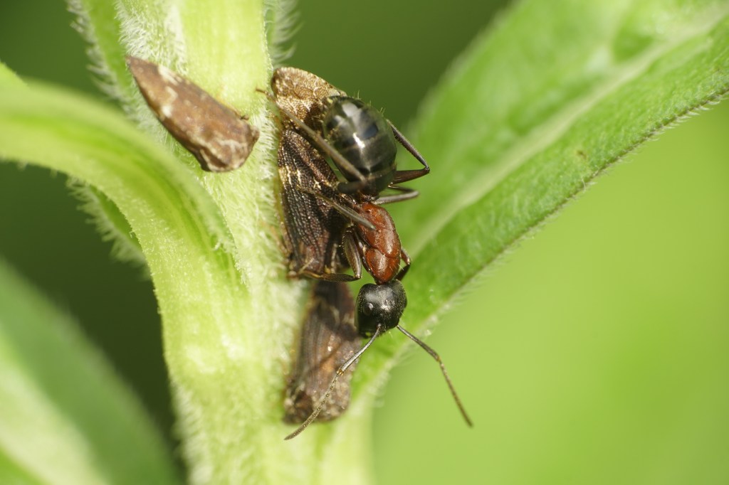 Adult Microdon flies do not behave like other syrphid flies; they do not hover around flowers, but instead remain very near the ant colonies which serve as larval hosts.
