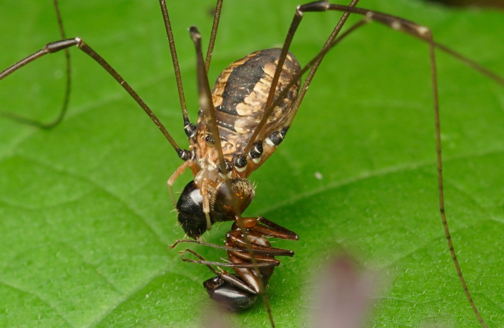 Well, not actually a spider. Opiliones are omnivorous, and here’s a capture of one eating an ant.