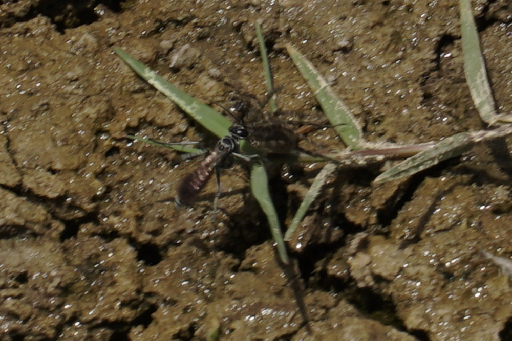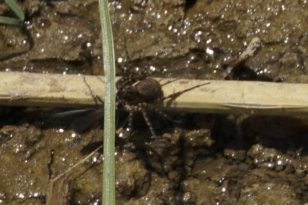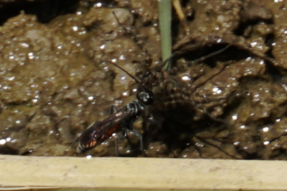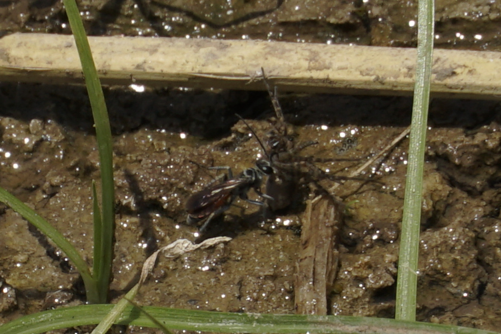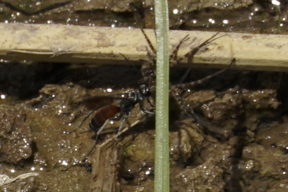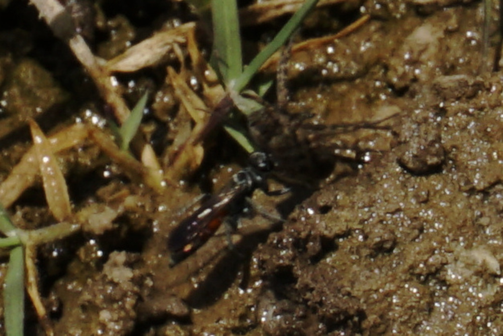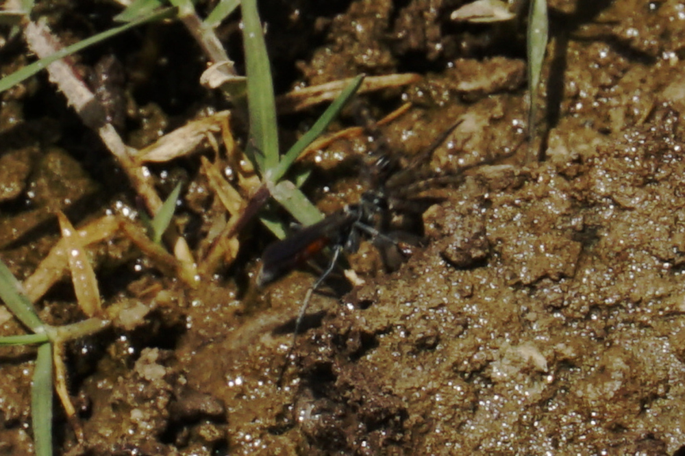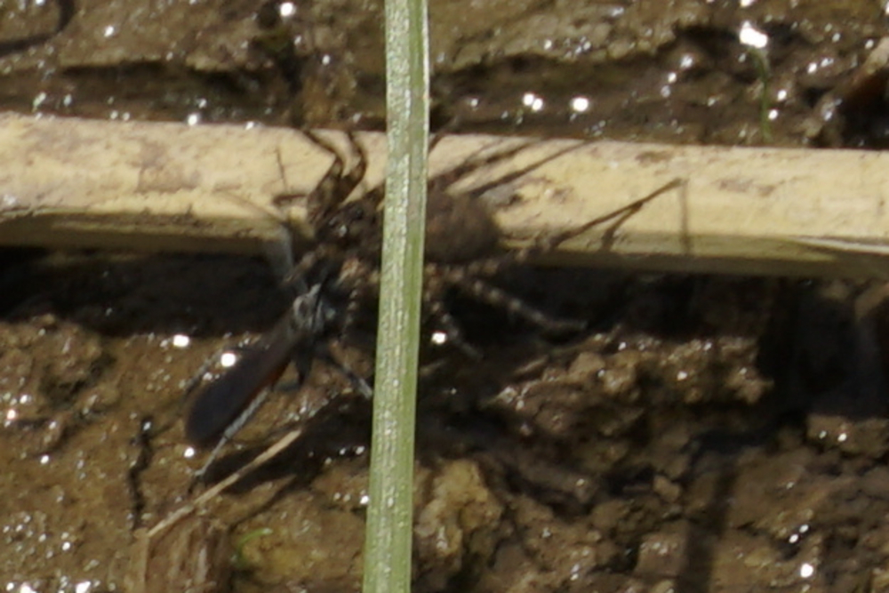 I apologize for the poor photo quality in the next few photos. There was a wasp behaving strangely on the other side of a long puddle. I took a bunch of photos on the assumption that this was a wasp, it had to be doing something interesting. After looking closely at the photos, I discovered that the wasp was a Pompilid aka spider wasp, and I had completely missed that she was leading a paralyzed spider back to her den as for for her babies. The spider was a wolf spider, and blended in with the mud.