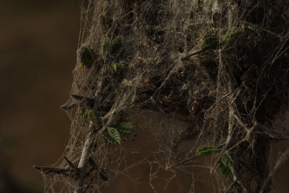 This was fascinating. I’ve never seen a social spider nest. It was windy and there were people waiting, so I couldn’t get a good photo of the spiders that made the nest, but it seems likely that they belonged to Stegodyphus cf sarasinorum, https://en.wikipedia.org/wiki/Stegodyphus_sarasinorum. Note that other species in the genus have been described nearby, e.g. https://www.researchgate.net/publication/349907336_Stegodyphus_semadohensis_A_new_species_from_family_Eresidae_recorded_from_Satpuda_Maharashtra_India_Arachnida_Araneae_Eresidae, and I have no way of distinguishing.