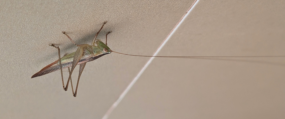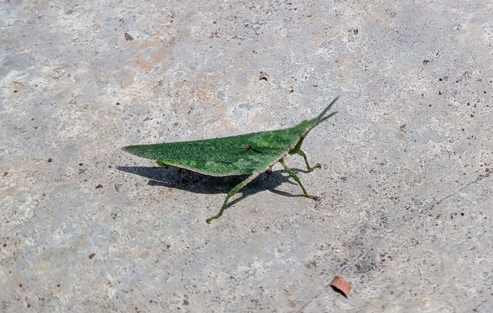 Apparently Lesser Meadow Katydid, Conocephalus. Note: long antennae = katydid, short antennae = grasshopper