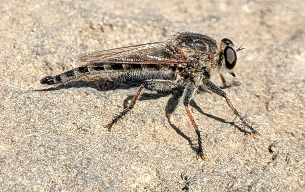 A gorgeous but sadly recently expired robberfly (Asilidae, probably subfamily Asilinae):