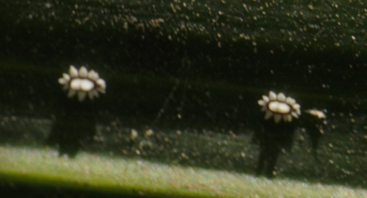 The palm tree next to the guesthouse had a bunch of these scale insects, probably genus Ceroplastes, the wax scale insects. these too can be fairly destructive if found in sufficient numbers.