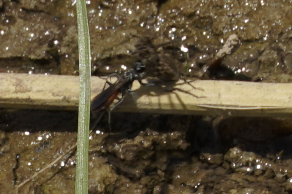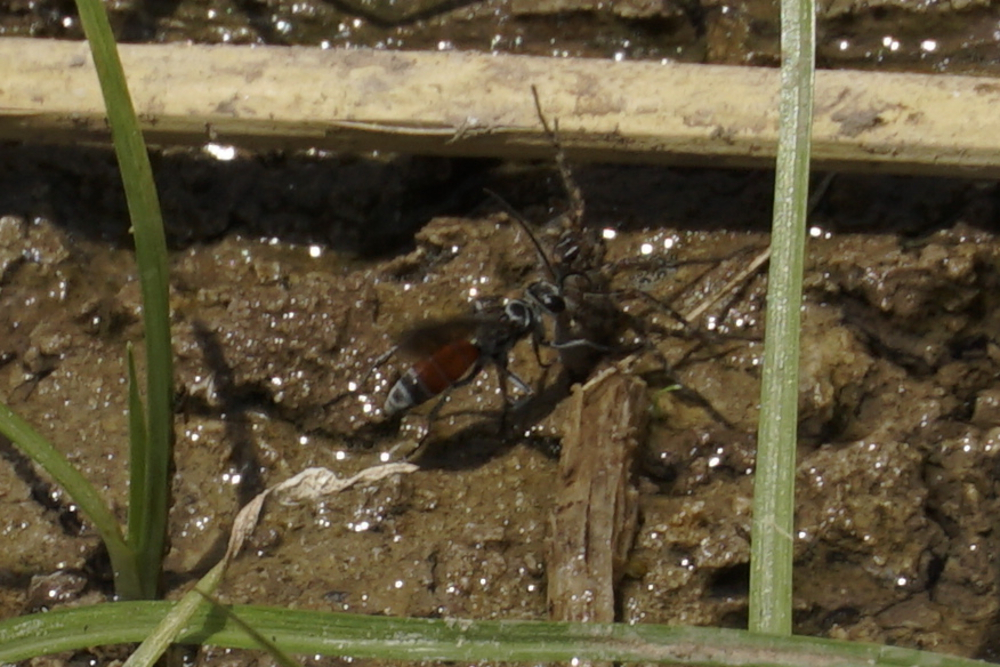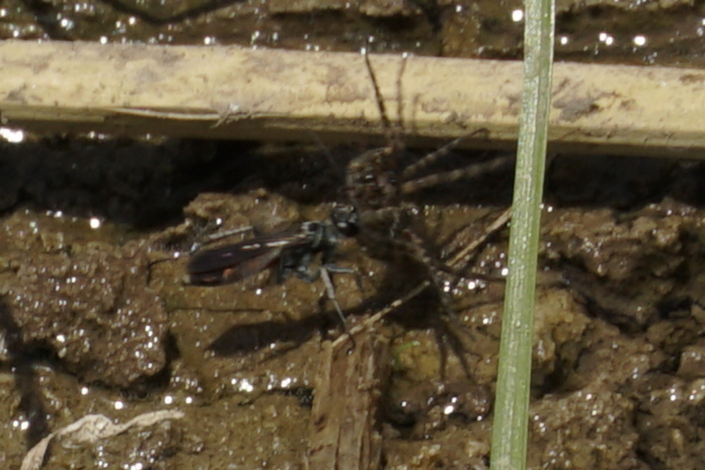 I apologize for the poor photo quality in the next few photos. There was a wasp behaving strangely on the other side of a long puddle. I took a bunch of photos on the assumption that this was a wasp, it had to be doing something interesting. After looking closely at the photos, I discovered that the wasp was a Pompilid aka spider wasp, and I had completely missed that she was leading a paralyzed spider back to her den as for for her babies. The spider was a wolf spider, and blended in with the mud.