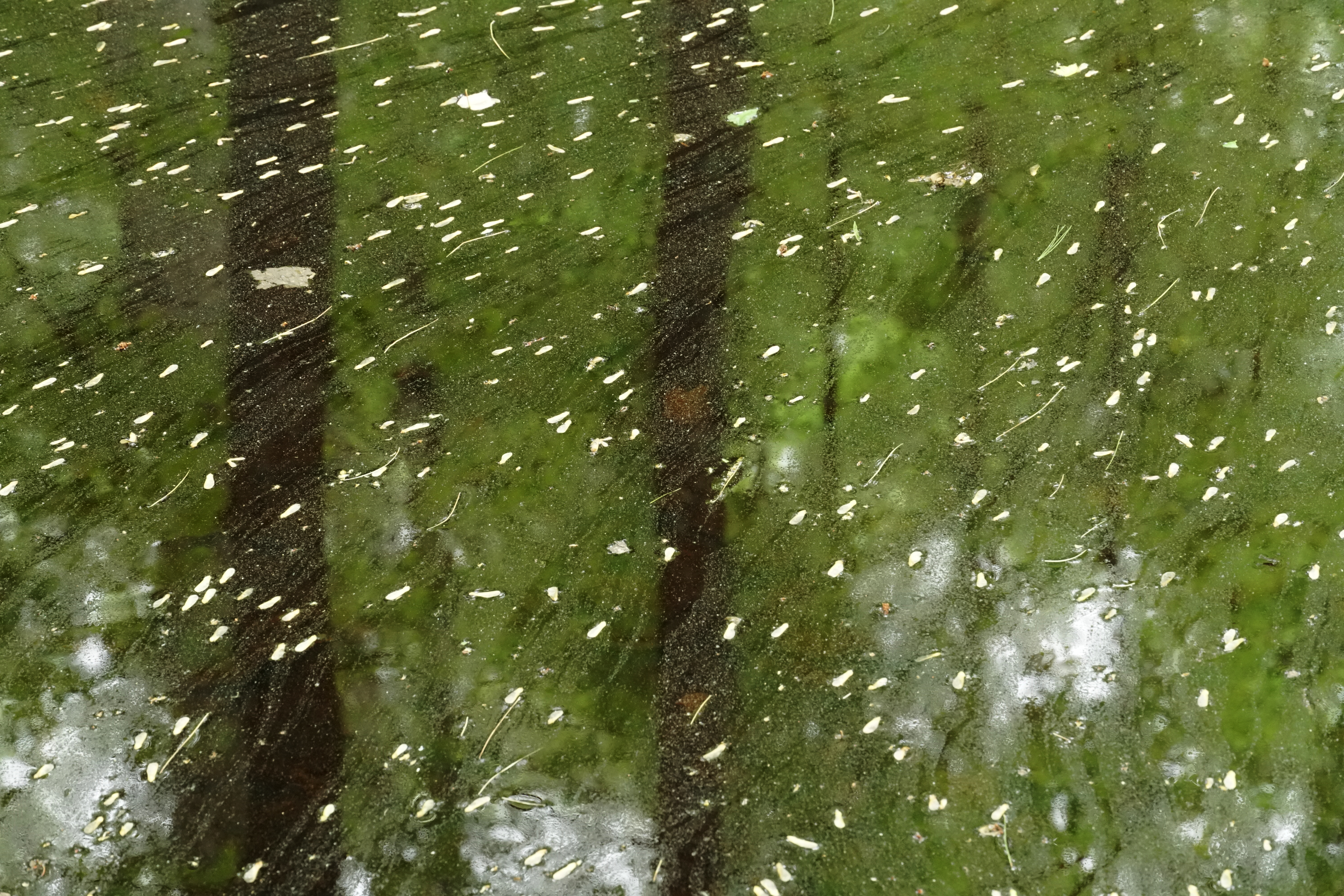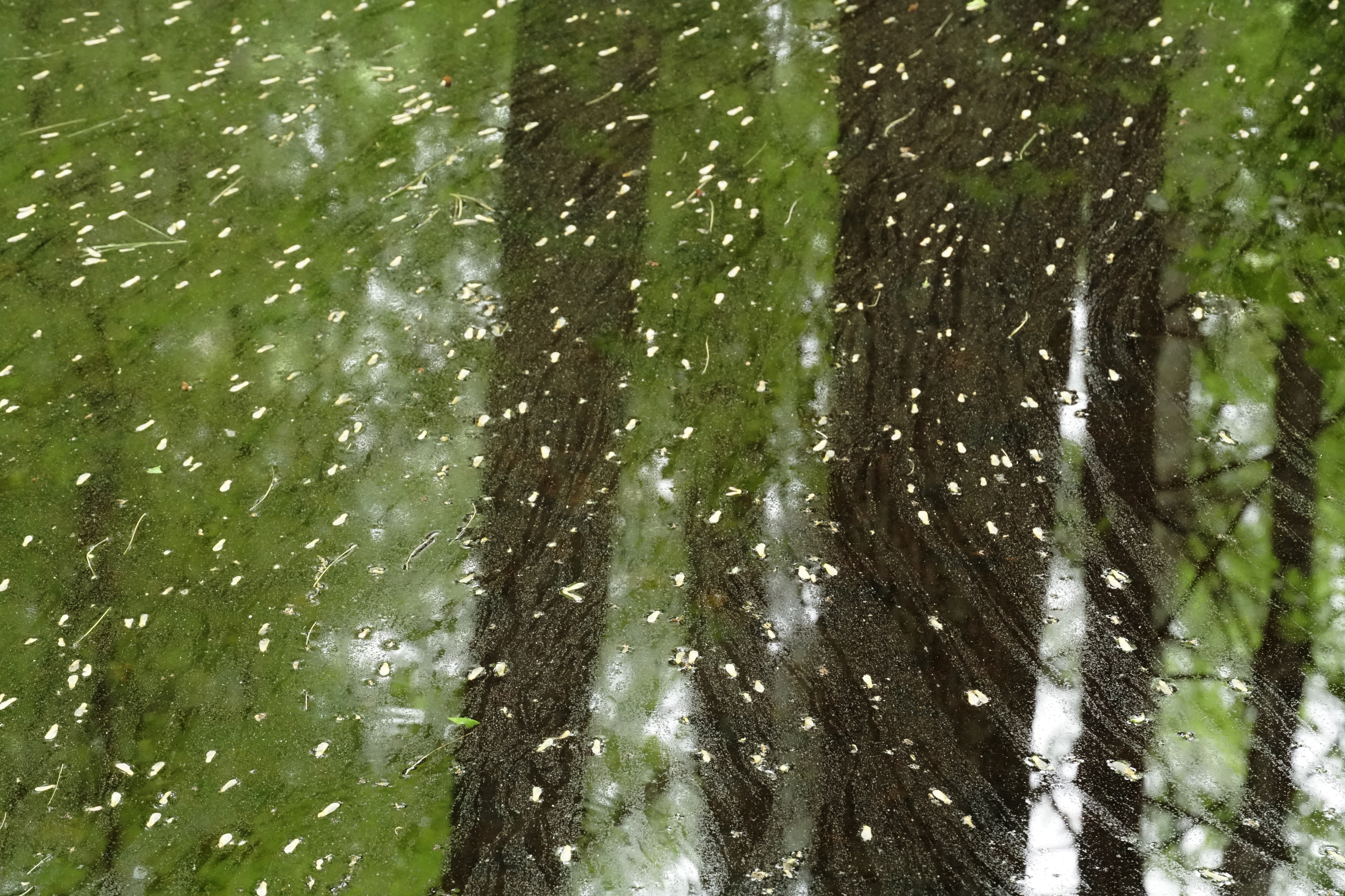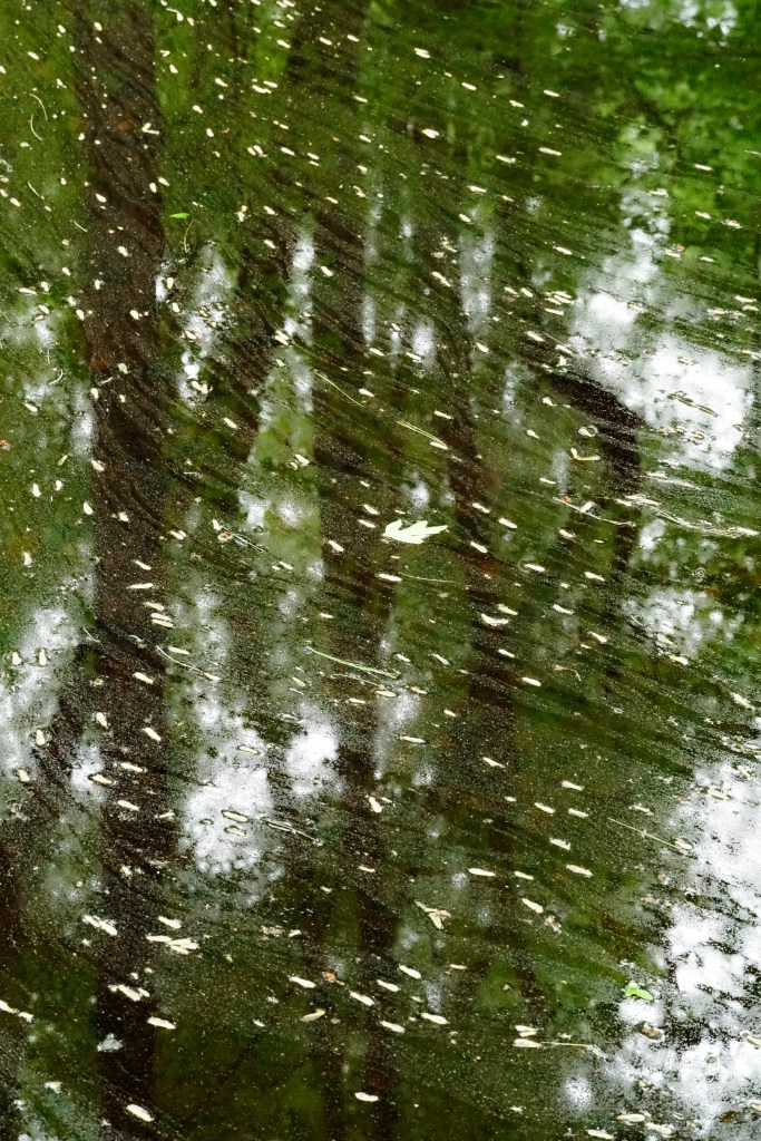 There was a puddle, not even a pond, and a lone Notonecta (milky backswimmer). From my vantage point, the backswimmer was swimming in the reflection of an electrical powerline tower, and that made for some very nice patterns in the water.