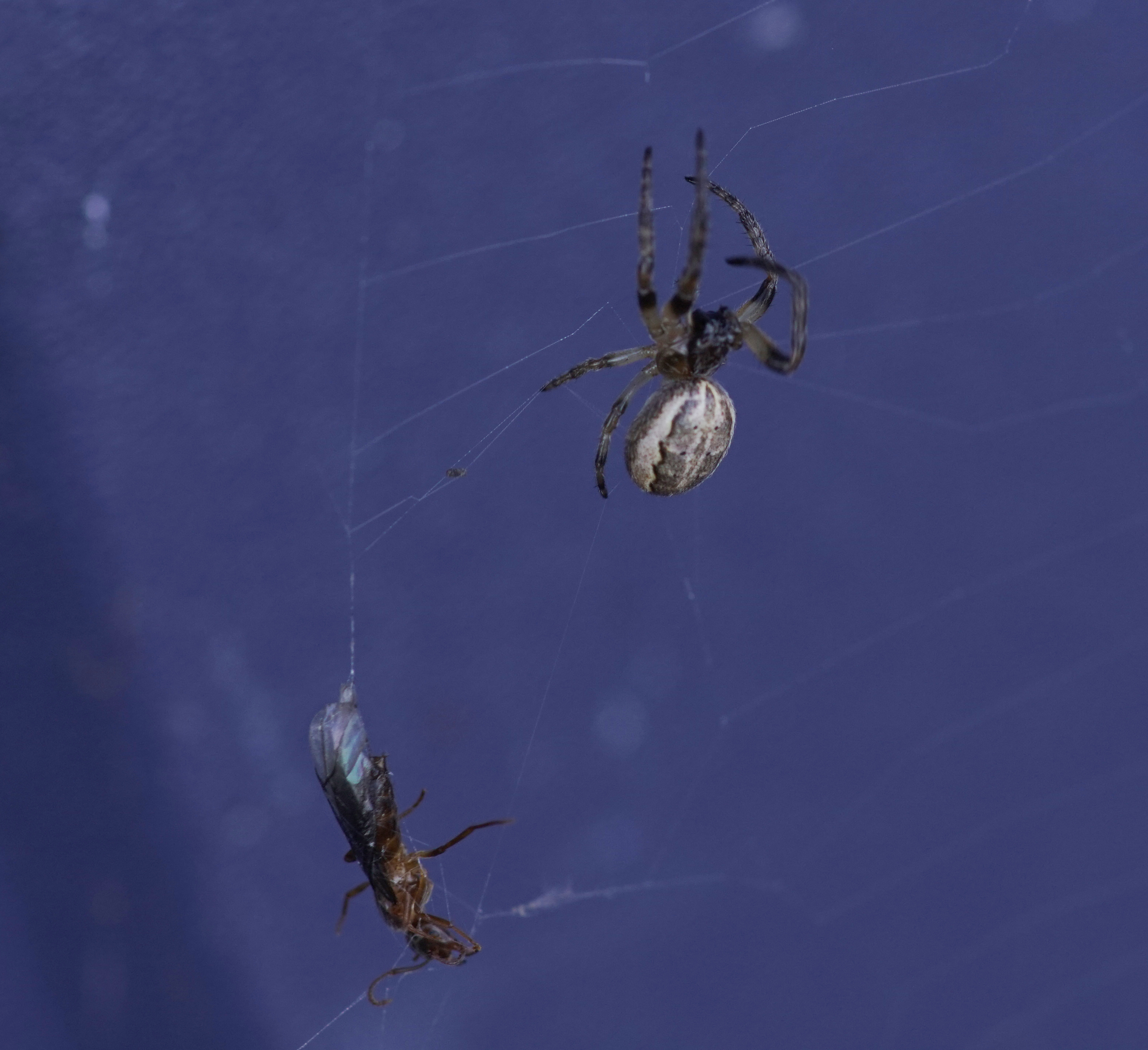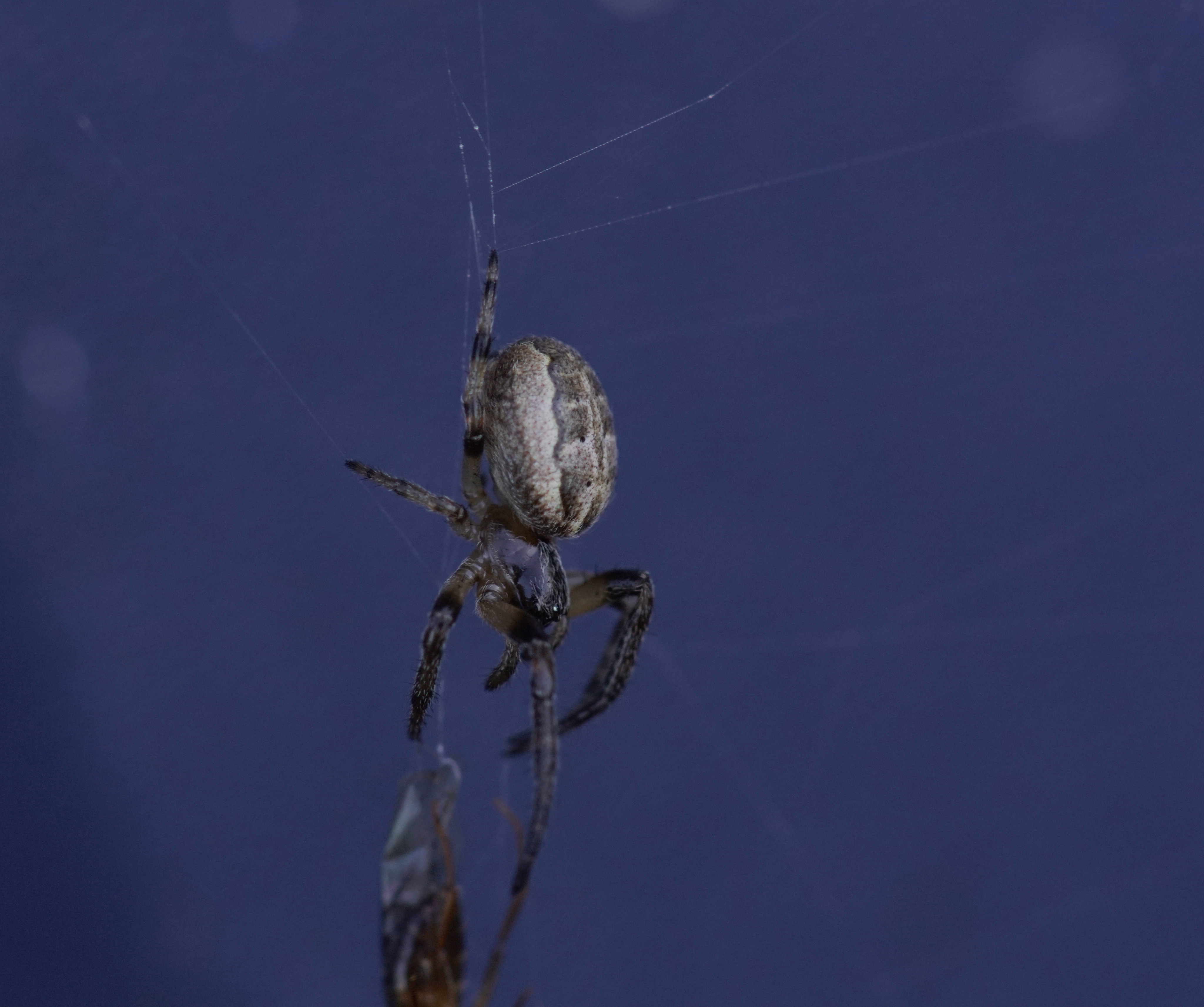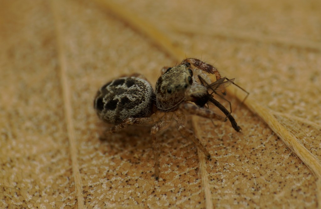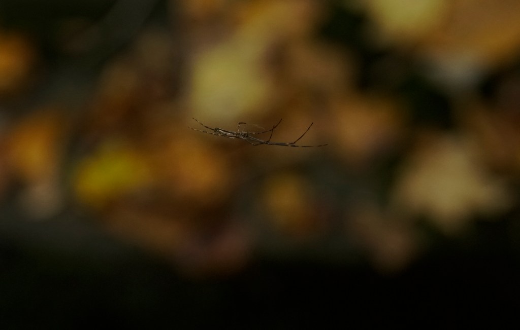 There was a little town of Uloboridae. There were about ten to fifteen of their distinctive webs (horizontal orb webs) in close proximity. I don’t know if this is usual (I’ve never seen it before), and if this just happens to occur from lack of dispersal or if they do this on purpose. Uloborus glomosus is what we have here.