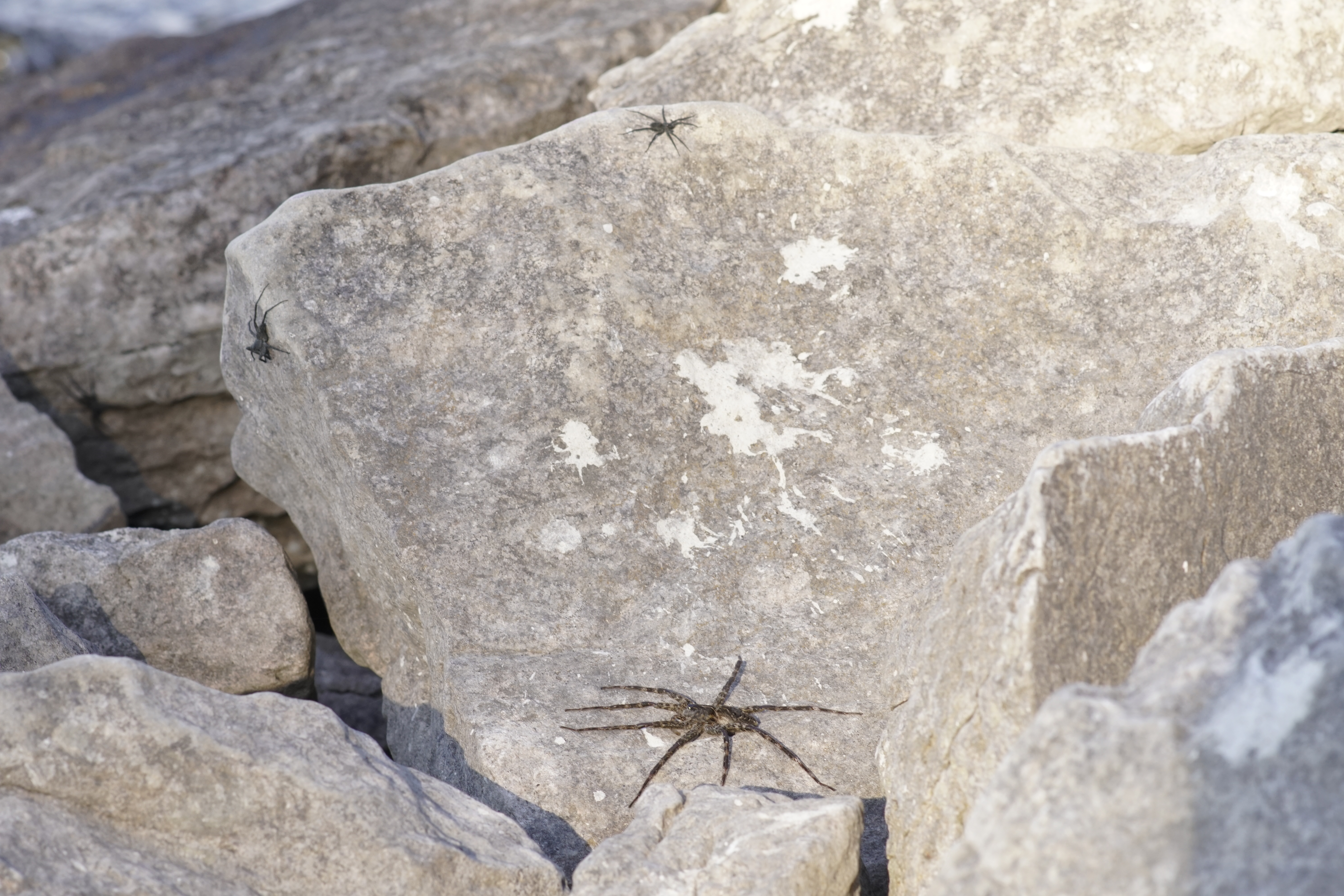 This fishing spider, Dolomedes (not sure whether D. scriptus or D. tenebrosus), was the largest I’ve ever seen. Maybe 3.5-4 inches including legspan (9-10 cm). In this photo, the two other spiders were larger than normal wolf spiders, but they’re dwarfed by this one.
