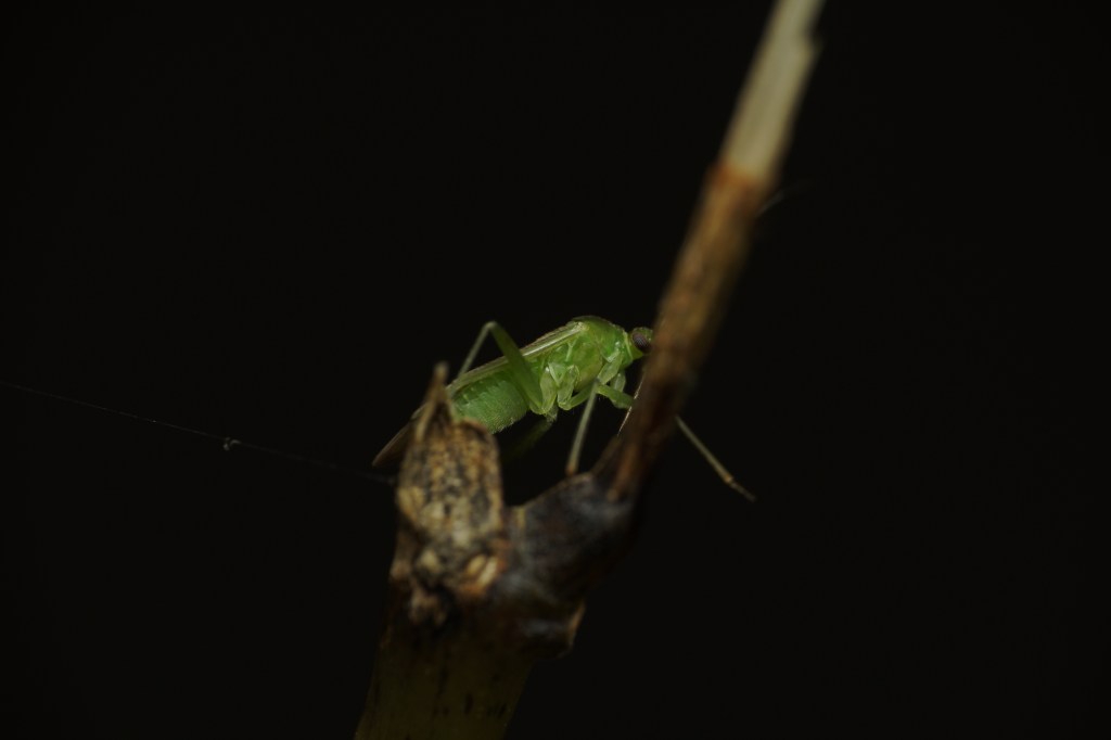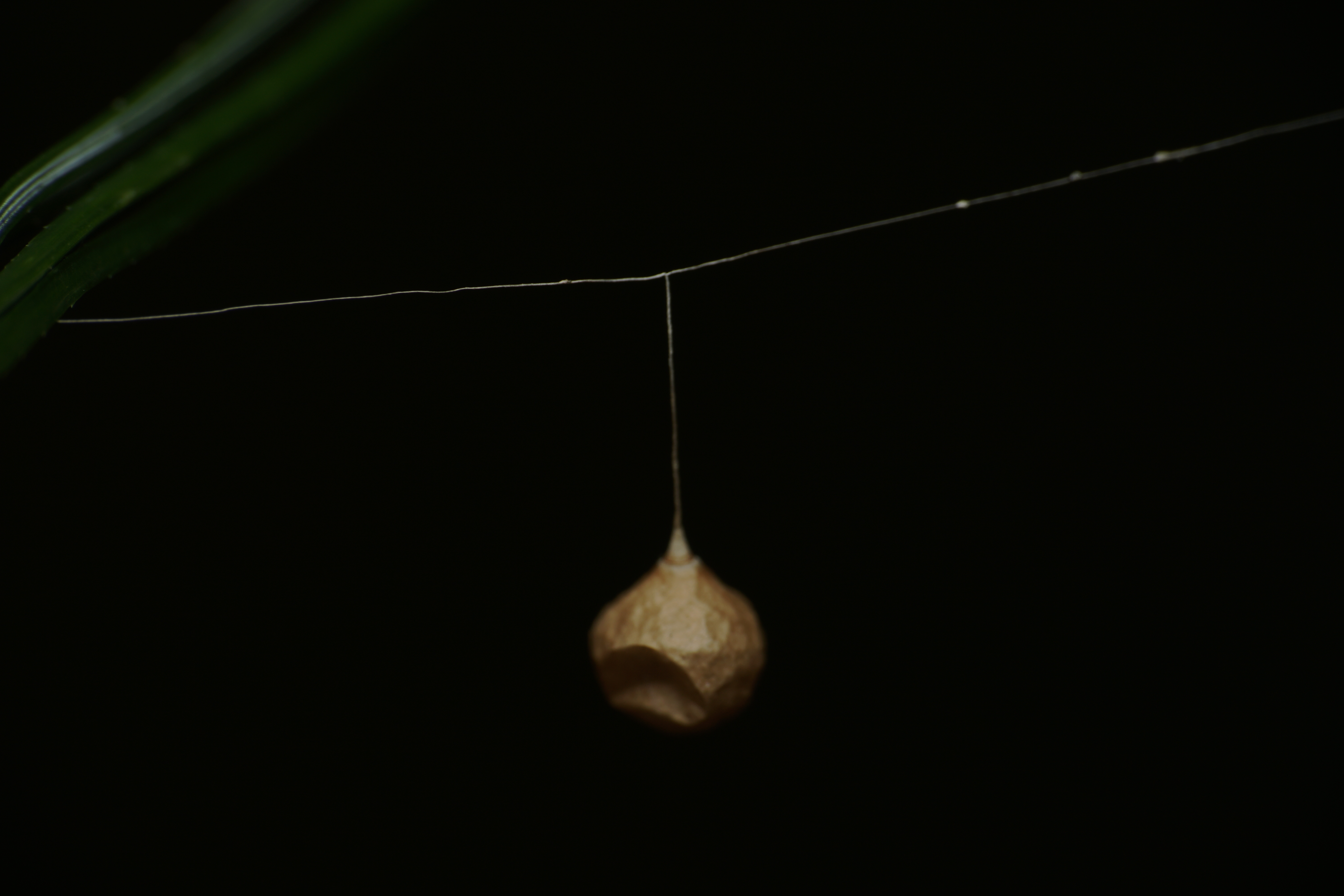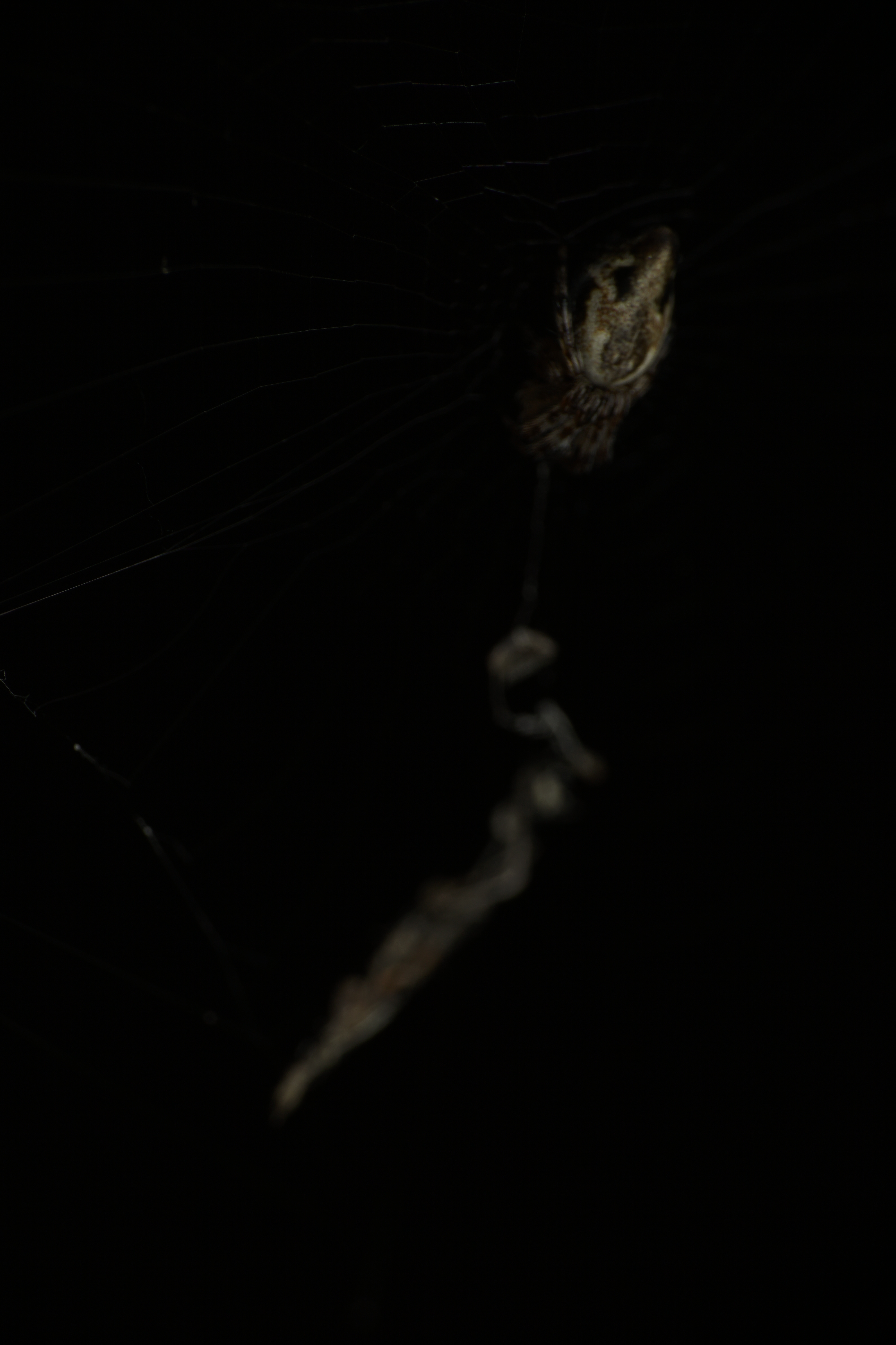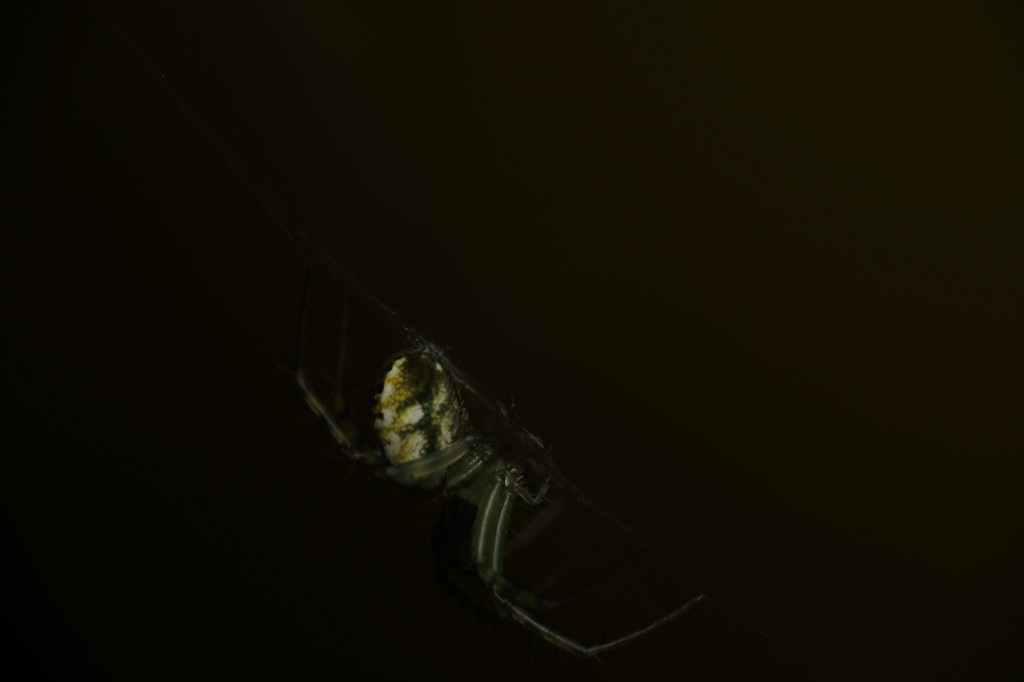 The orbweaver was hiding in this rolled leaf; only the flash brought it out to be visible.