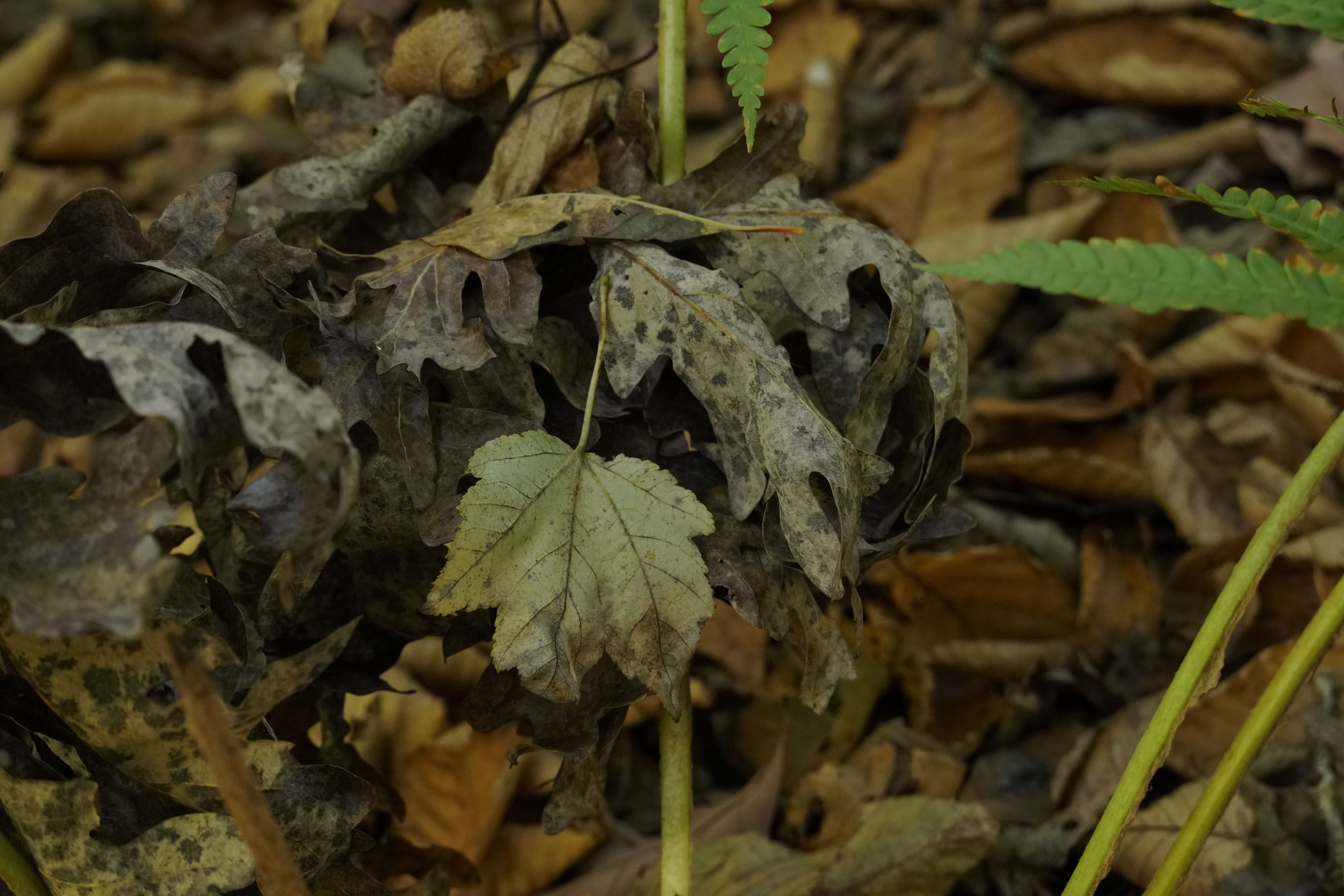I loved the colors here. Rhododendron leafhopper, Graphocephala fennahi. The fern ball nest is likely Herpetogramma moths.