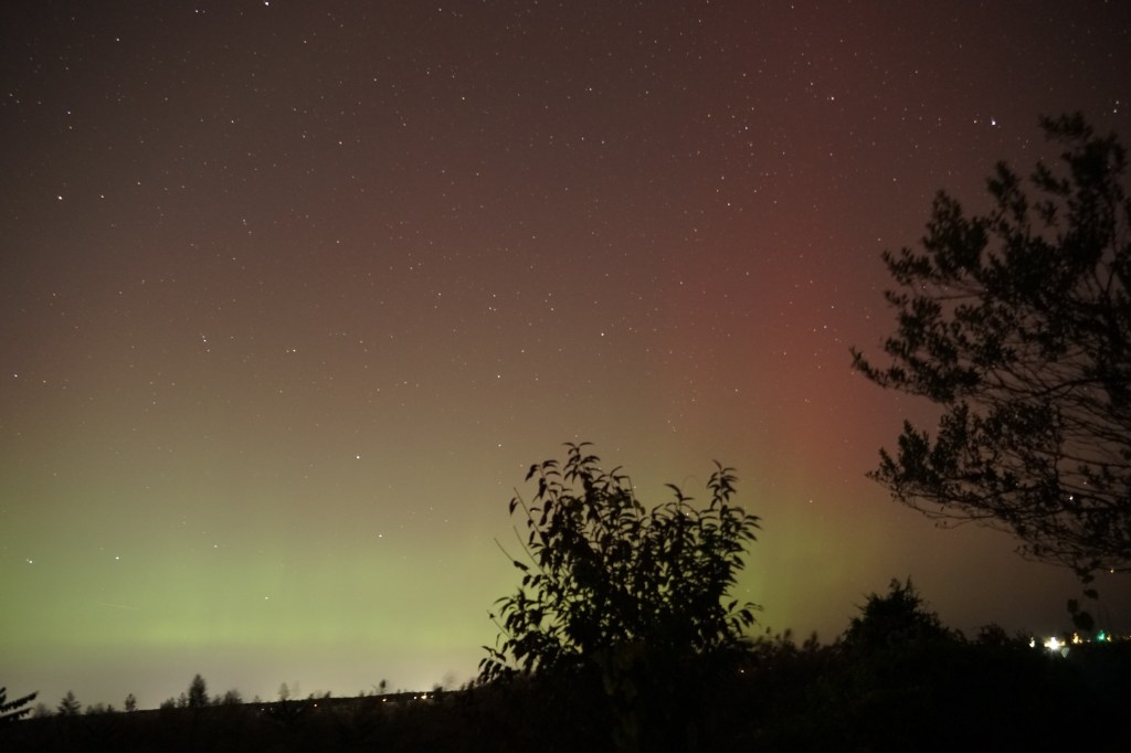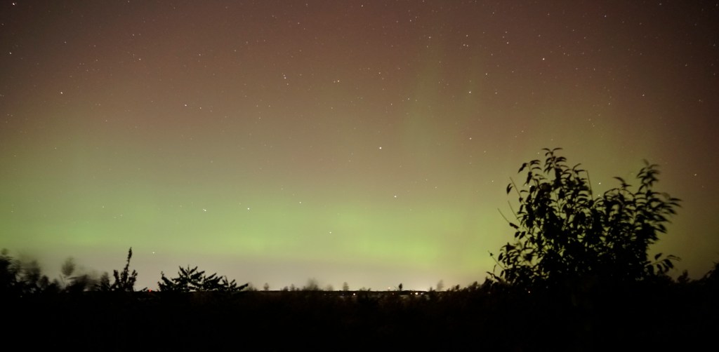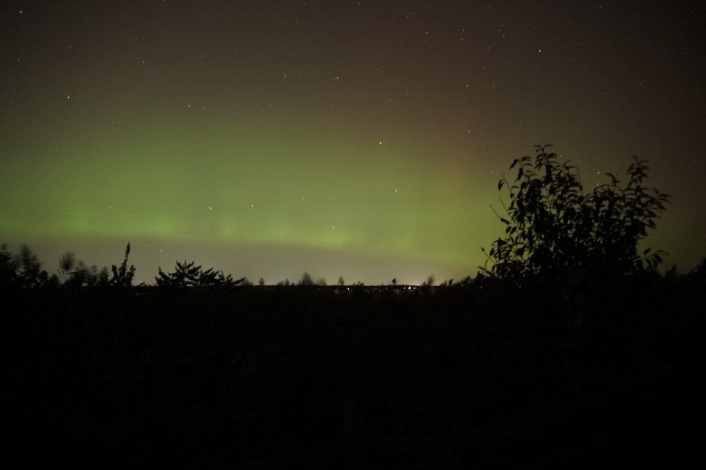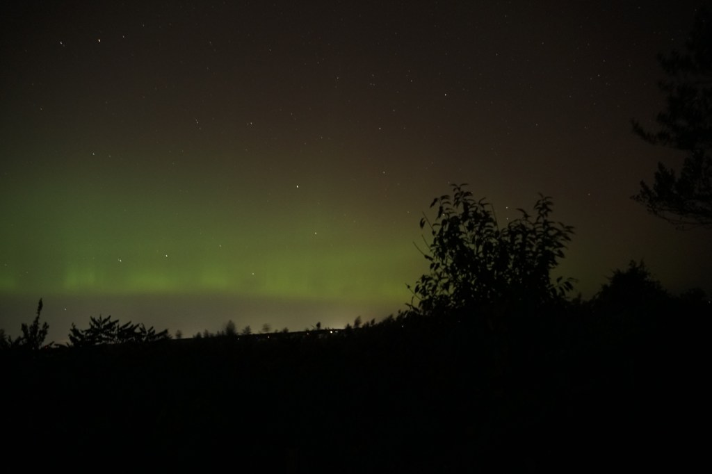 Unfortunately, I got there a little too late for the really spectacular action. But there was still quite a bit left. Towards the end, we got a lot of the green (lower atmosphere monatomic oxygen, see https://sciencenotes.org/aurora-colors-explained-southern-and-northern-lights/) with some nice interesting shelf-and-curtain structure.