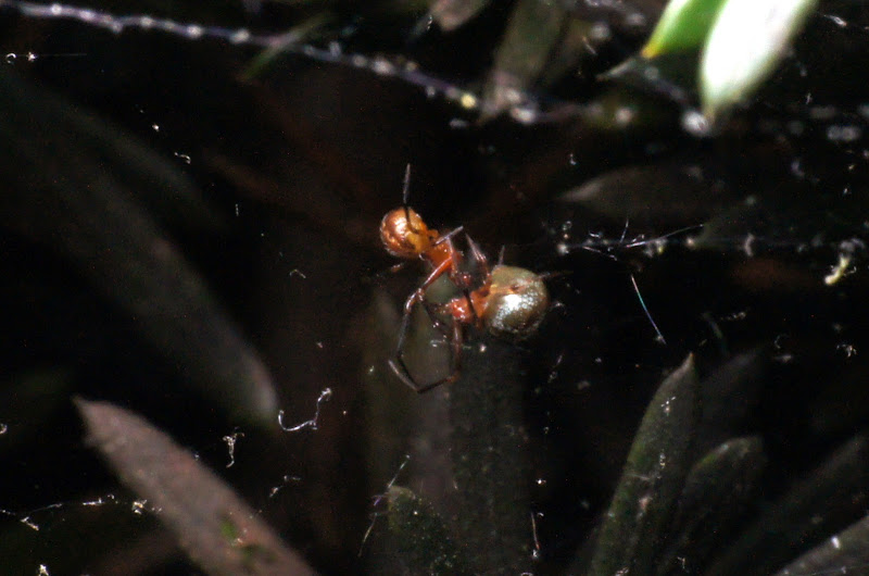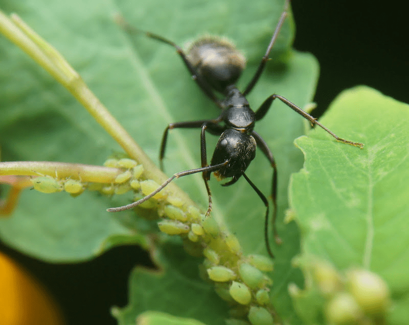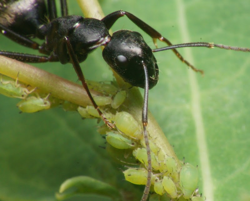 Note the drop of honeydew the aphid is secreting for the benefit of the ant: