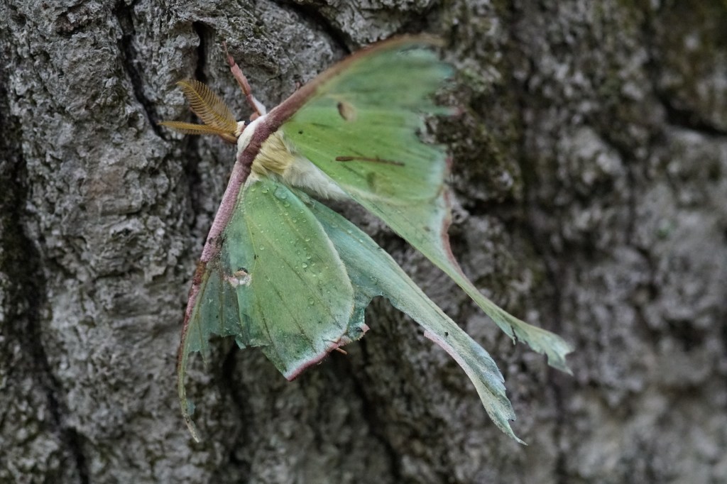 The star of the show! A Luna moth. He (male, look at the antennae) has been through a lot, as seen by his wings. I hope he had a good life and reproduced!