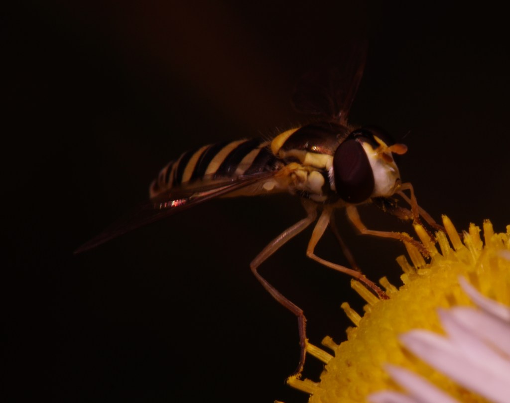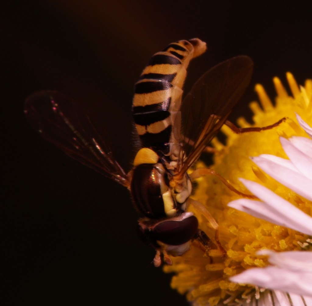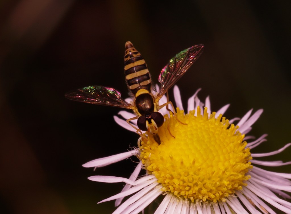 Syrphid fly. Epistrophe, or perhaps Eupeodes cf americanus. Or Syrphus cf torvus. Syrphus cf ribesii? Parasyrphus, but I don’t think so. EDIT: Sphaerophoria suggested