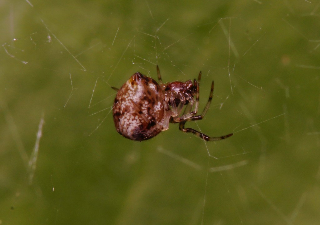 For the last few years, we’ve had plenty of little Theridion spiders nesting outside the front door. This morning, a little hanky-panky — they were busy making little Theridions. Note the distended palps on the male, indicating he has already loaded up the sperm sacs into his pedipalps for mating.