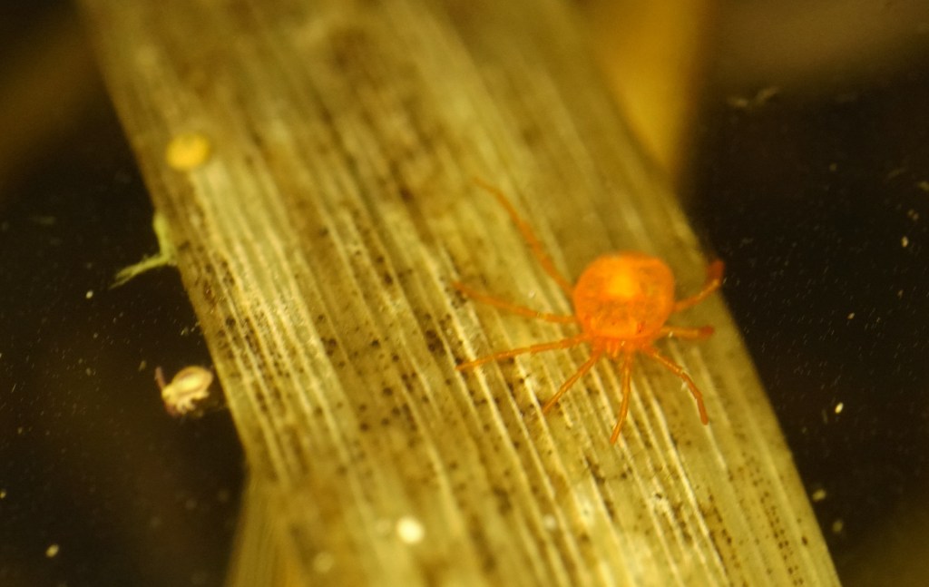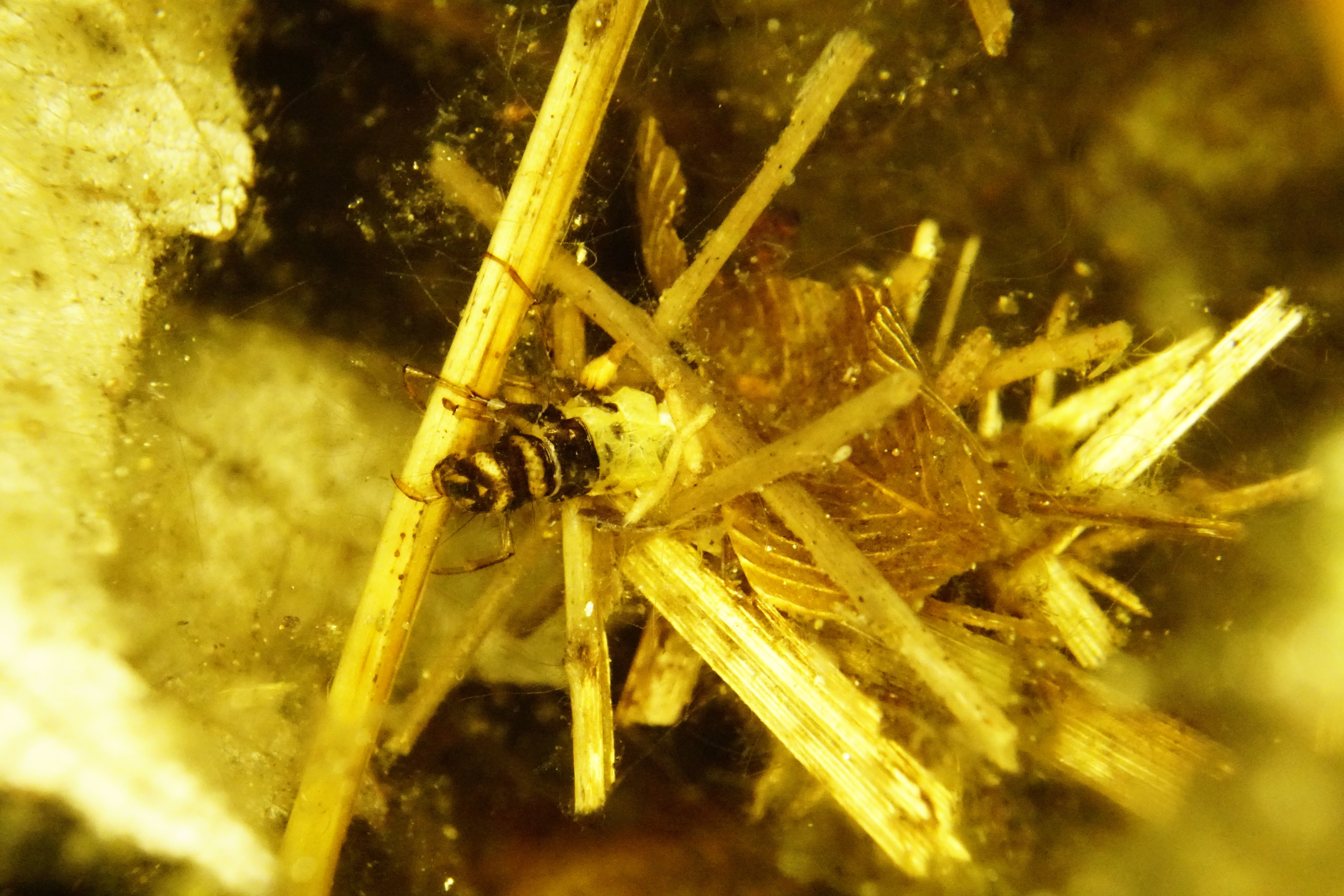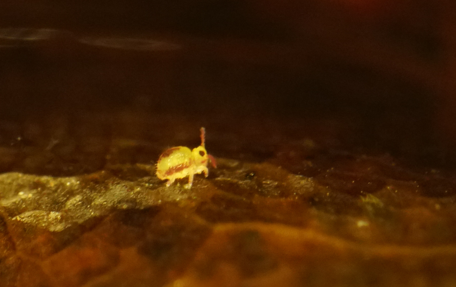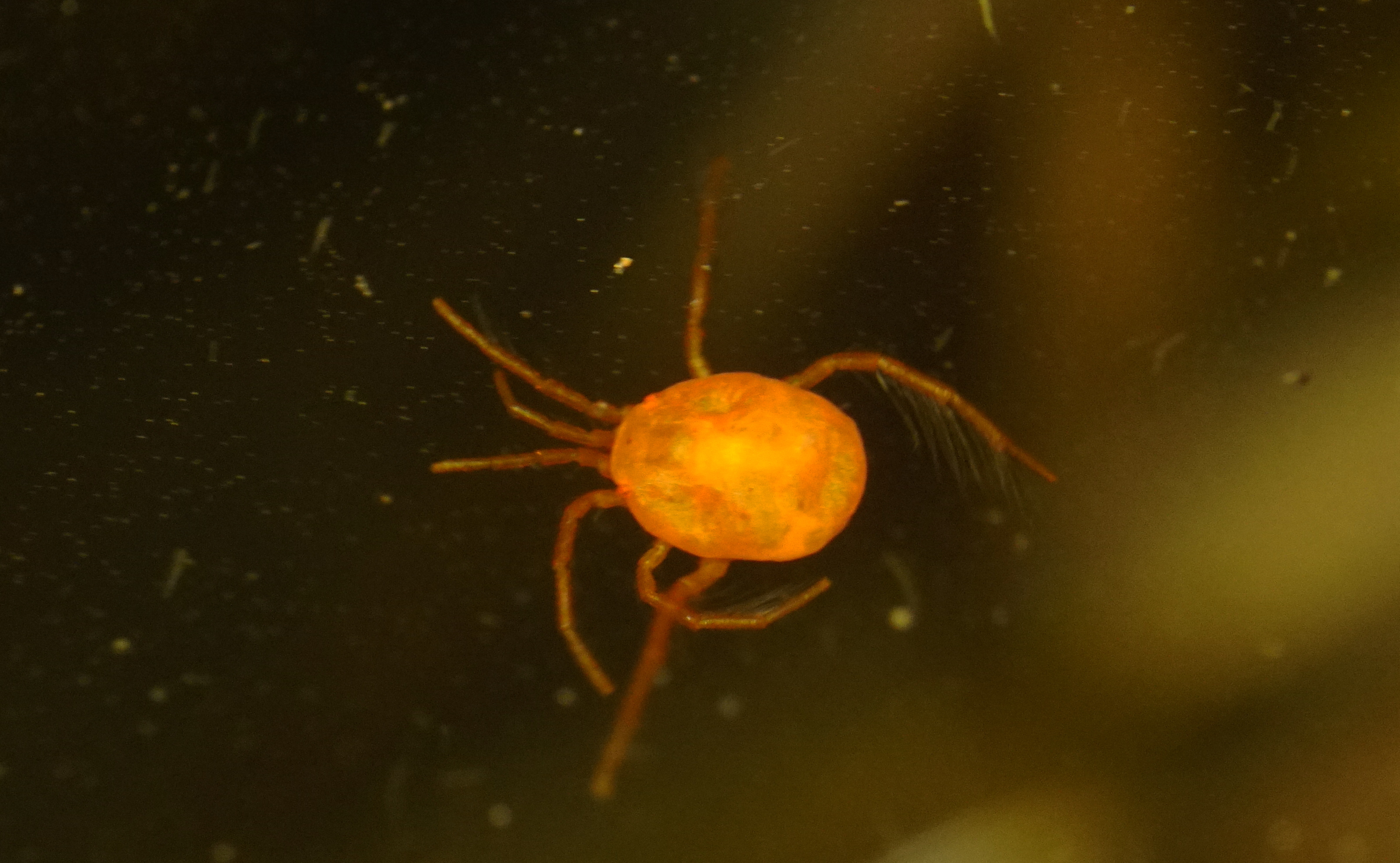 Water mite, Hydrachnidia, with a springtail photo-bombing, as springtails do.